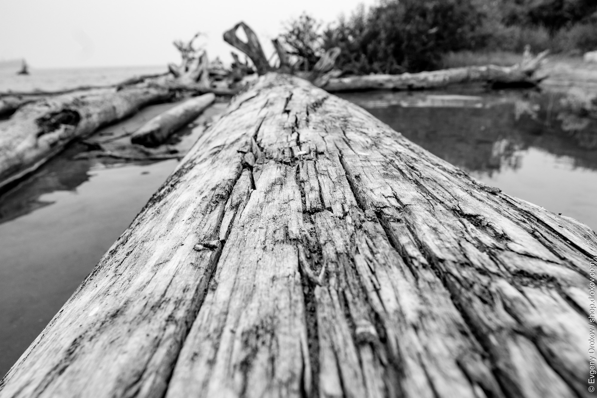 This black and white composition captures a weathered log on the Ob Sea shore in Novosibirsk, Russia, during July 2012. The stark texture of the wood against the water emphasizes the raw beauty of nature's enduring elements.