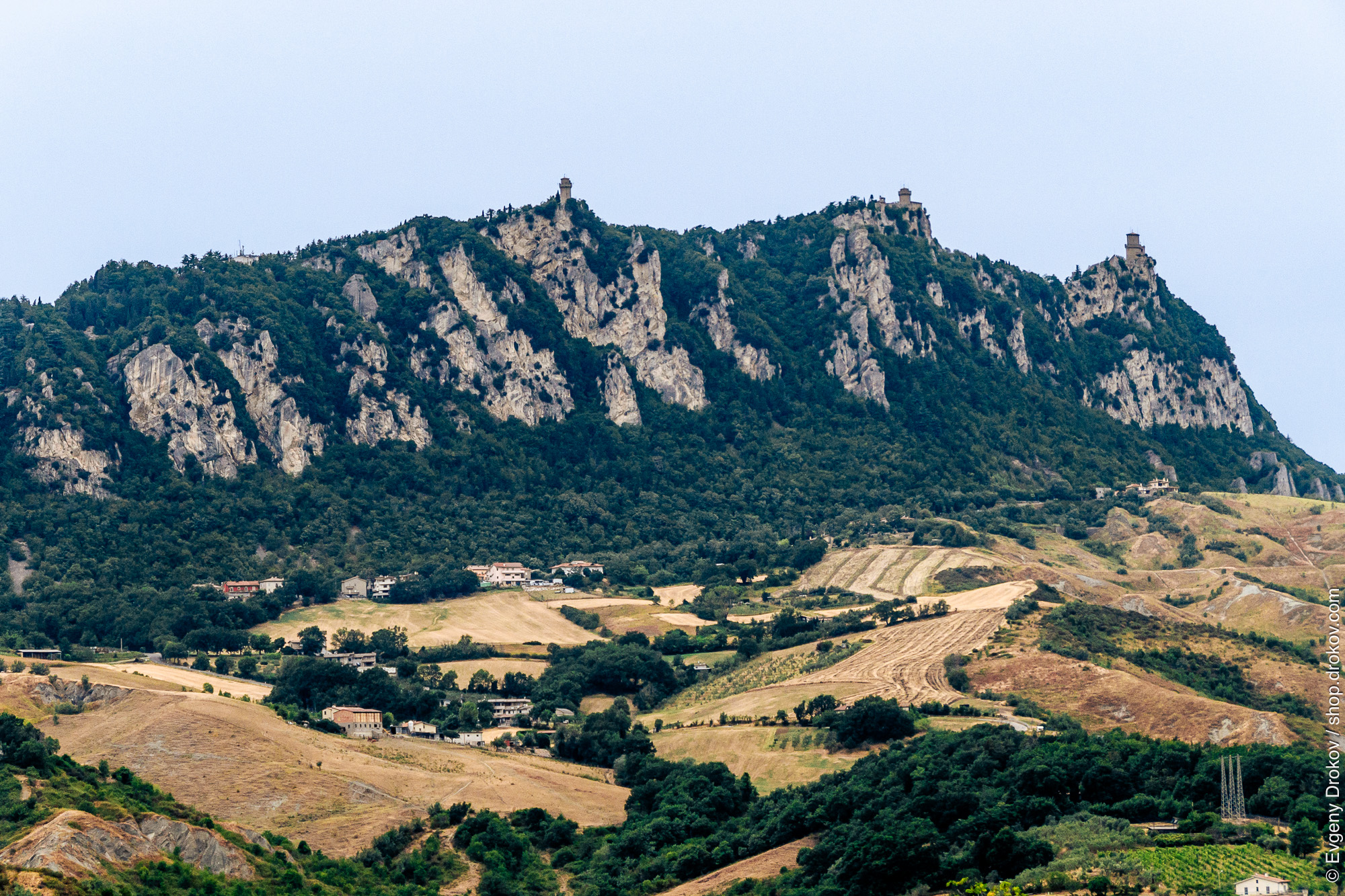 This expansive landscape showcases the rugged beauty of Faetano, San Marino. Towering structures crown the mountaintops, overlooking agricultural fields and rural Italian hillside homes. The vista captures the enduring spirit of this historic region.