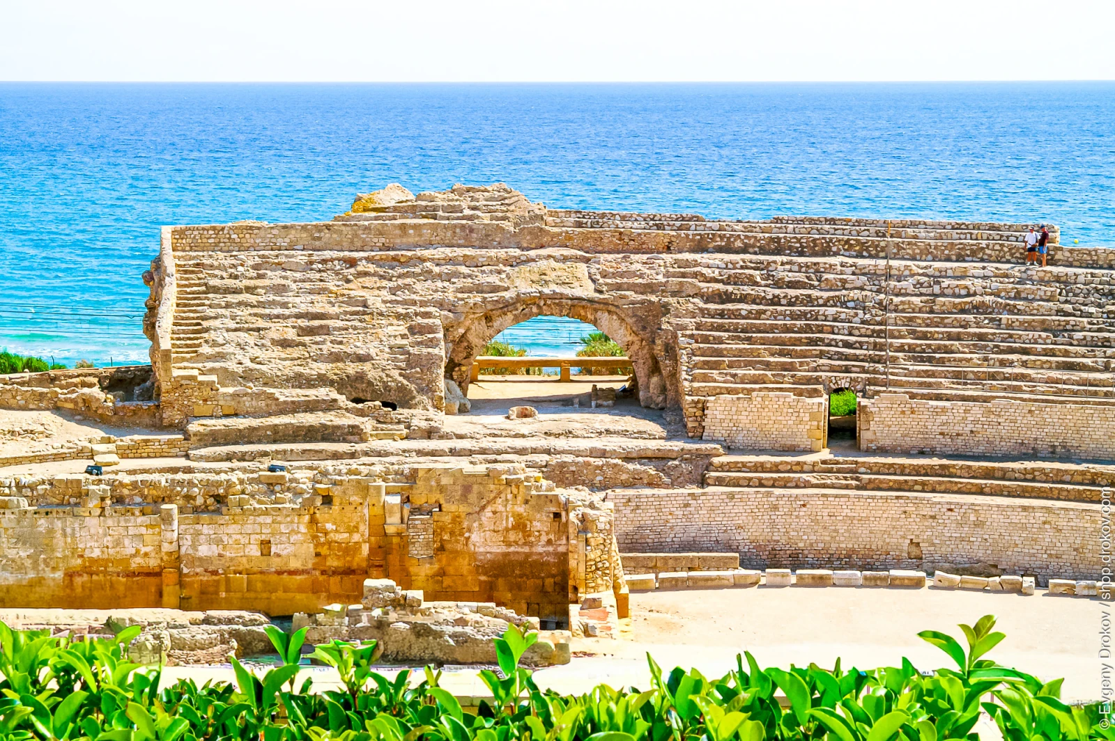 Two individuals stand on the ancient stone tiers of the Roman Amphitheatre in Tarragona, Spain, in September 2006. This iconic structure, a testament to Roman engineering, overlooks the Mediterranean Sea, offering a glimpse into historical entertainment and public life.
