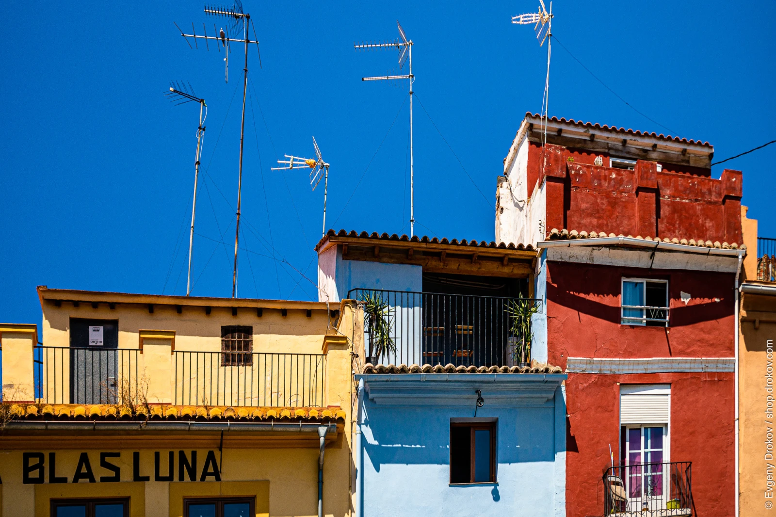 This is a vibrant architectural study of colorful buildings in Valencia, Spain. The composition highlights the textures and hues of the facades against a clear blue sky, showcasing the unique character of the urban landscape.