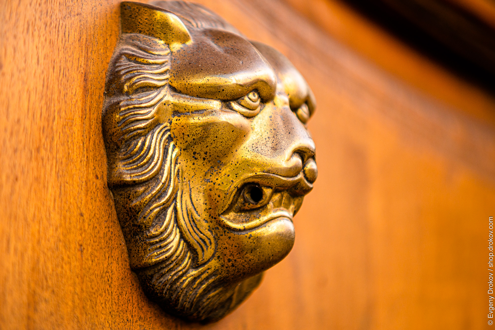 A detailed close-up of a golden lion head door knocker, a symbol of strength and protection, is presented. This striking detail was captured on a wooden door in Valencia, Spain, highlighting the rich craftsmanship and historical character of the location.