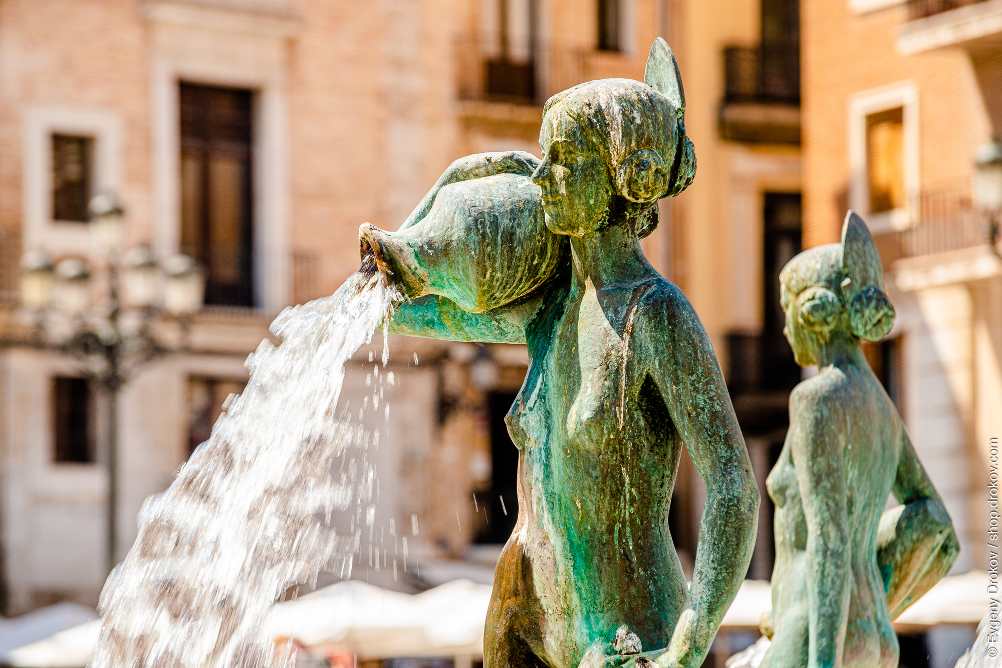 A bronze fountain sculpture of a woman pours water in Valencia, Spain. This artwork captures the essence of the city's vibrant public spaces and rich artistic heritage.