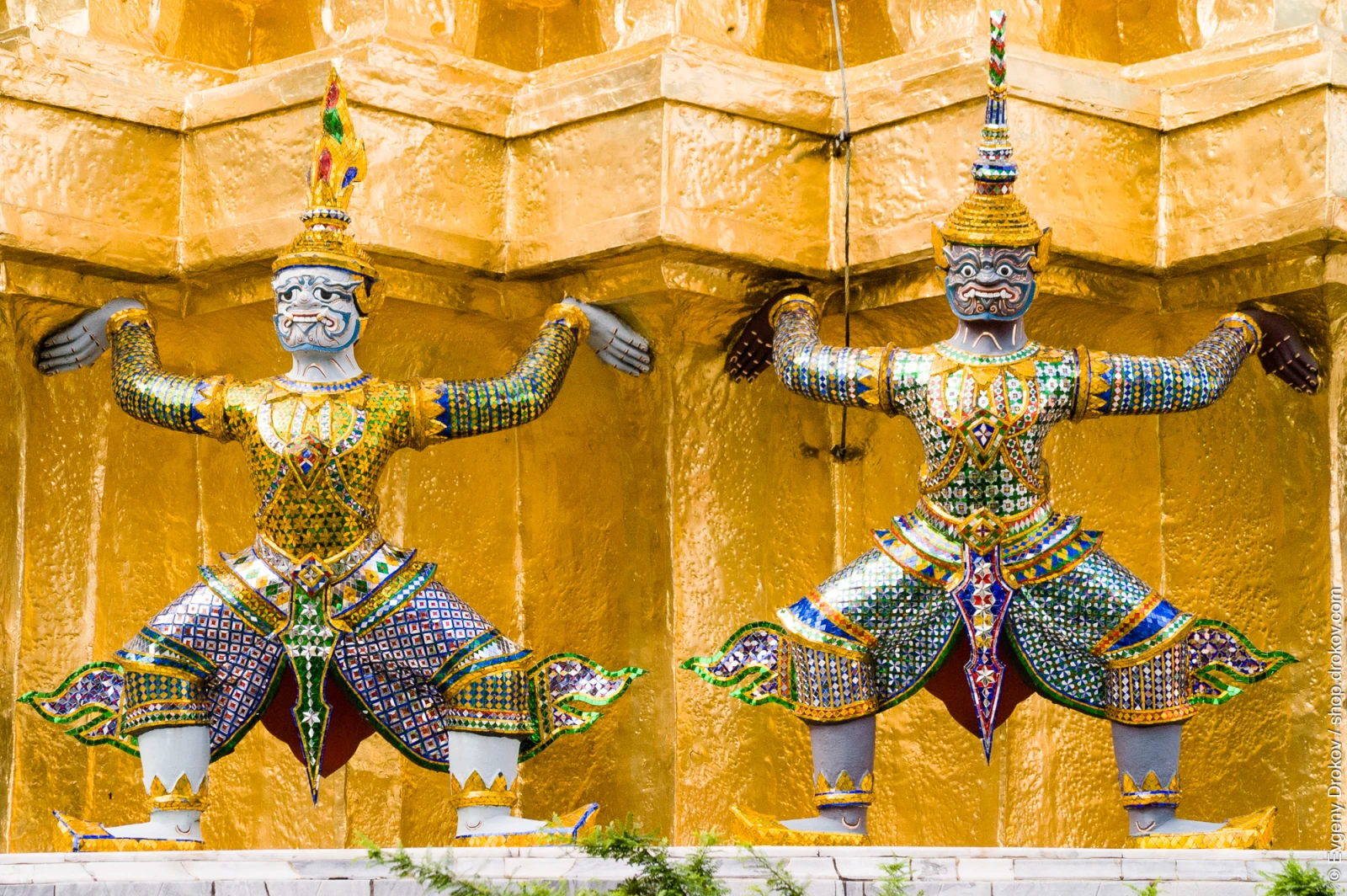 Two ornate Thai guardian deities, known as yakshas, stand guard on a golden temple wall in Bangkok, Thailand. Their intricate mosaic armor and fierce expressions serve as a decorative element, designed to ward off evil spirits.
