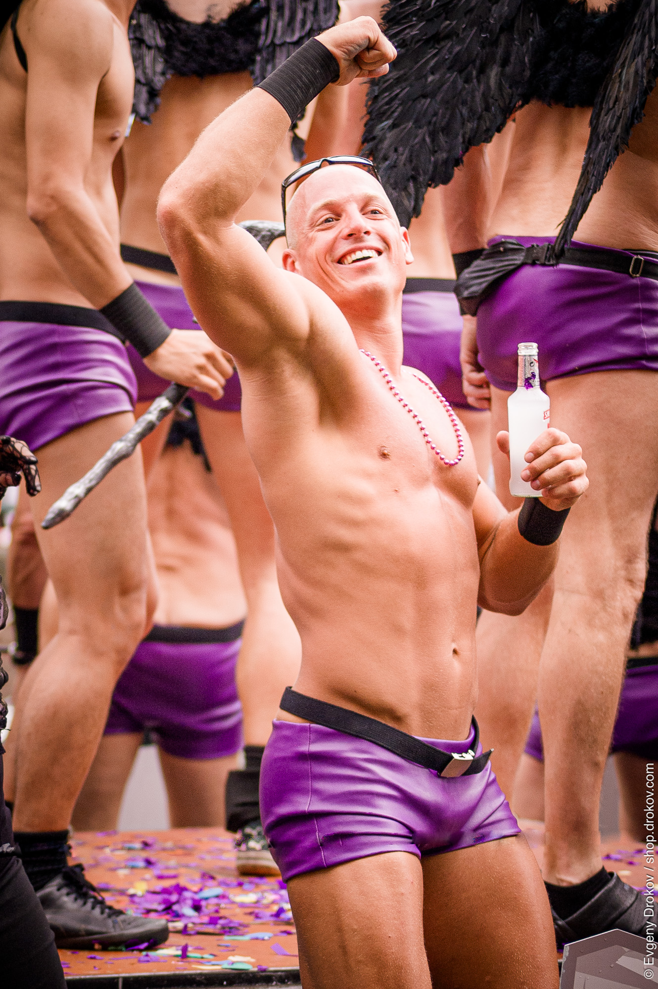A man, radiating joy and confidence, celebrates at a Pride parade. He's wearing purple shorts, a beaded necklace, and sunglasses. He's holding a bottle, clearly enjoying the festivities. This photo embodies the spirit of pride and community.