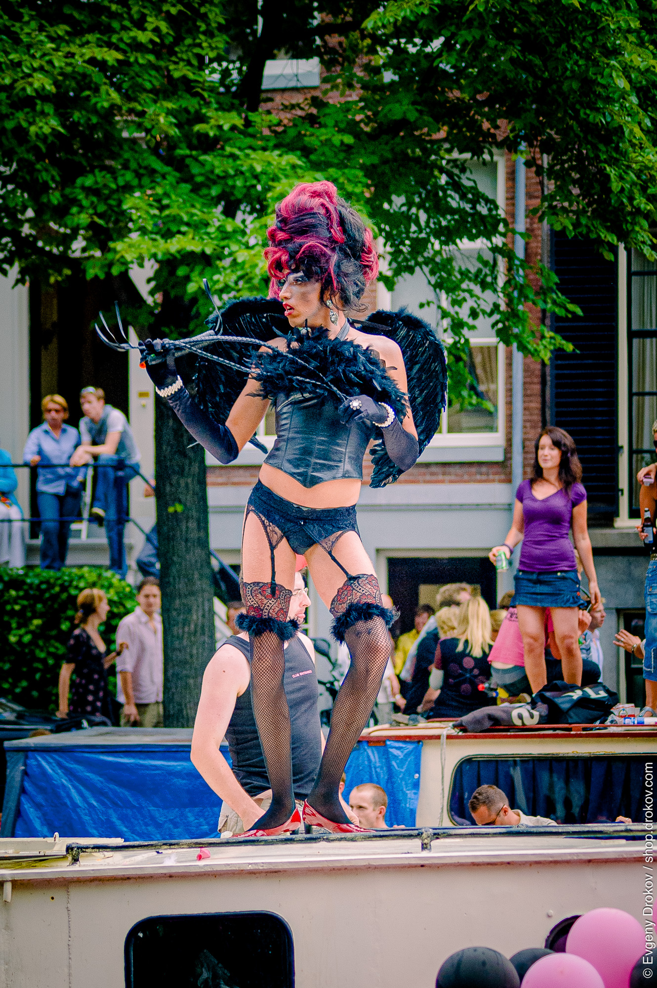 A performer in elaborate costume, complete with wings and a whip, commands attention on a boat during Gay Pride Amsterdam 2008. This vibrant celebration of LGBTQ+ pride and culture took place in Amsterdam, Zuid Holland, The Netherlands.