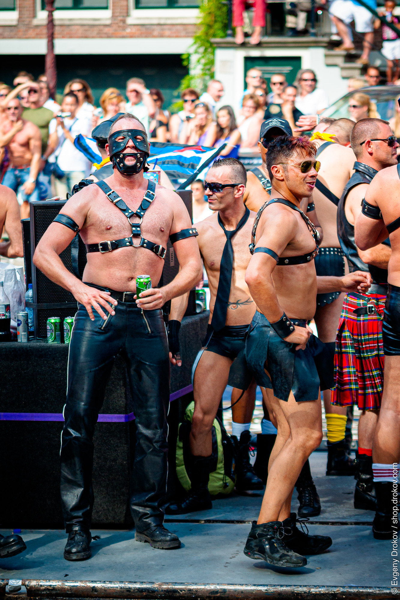 Men in leather attire and a kilt participate in a vibrant street parade, celebrating LGBTQ+ pride with an energetic display.