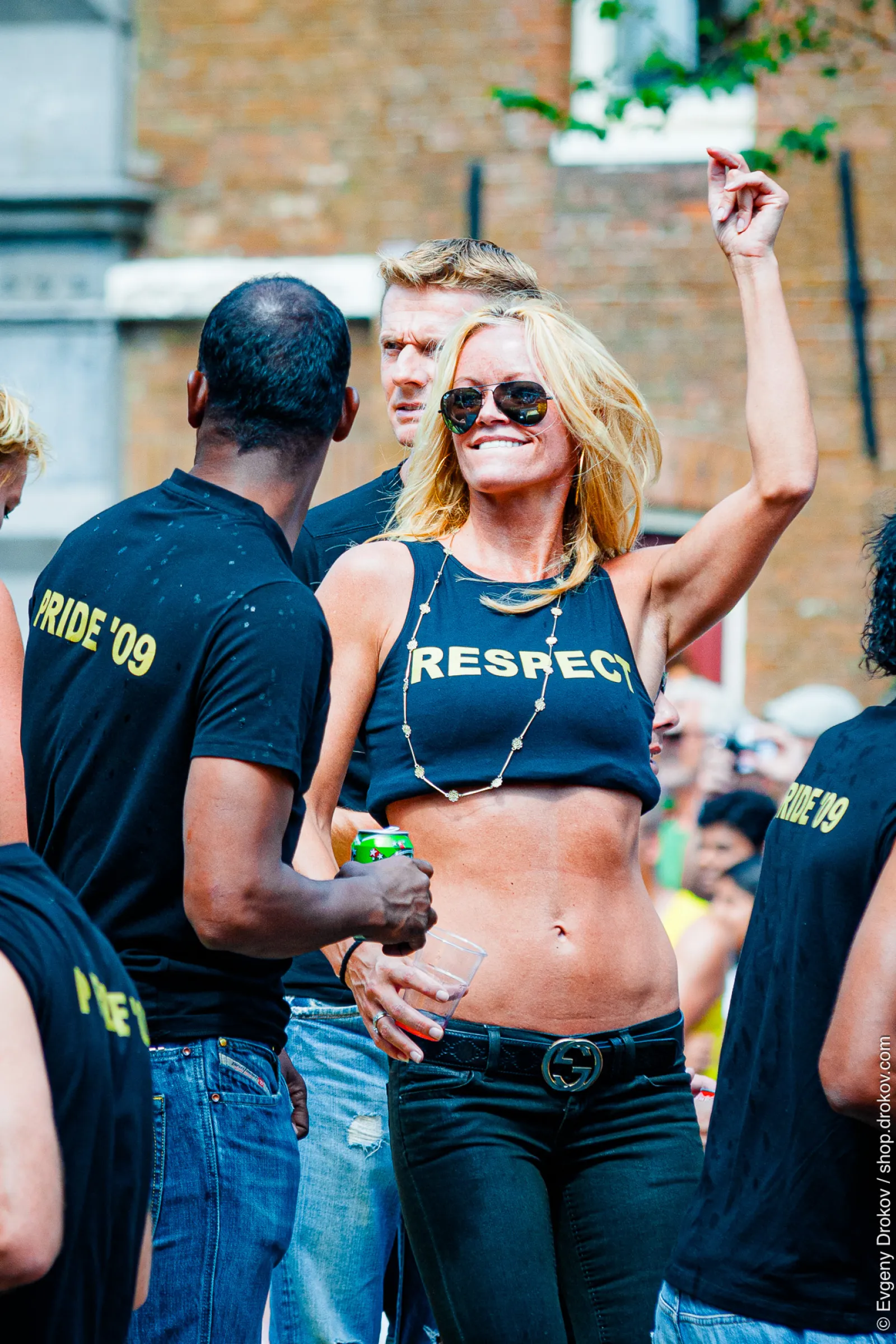 A woman wearing a "RESPECT" tank top and sunglasses celebrates at a Pride event in 2009. She is surrounded by others in matching "PRIDE '09" shirts, signifying their participation in the annual LGBTQ+ celebration.