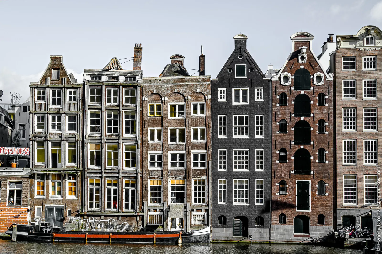A row of historic canal houses stands proudly in Amsterdam, The Netherlands. Their unique gabled facades and varied brickwork showcase the city's rich architectural heritage. This view captures the enduring charm and character of Amsterdam's iconic waterways.