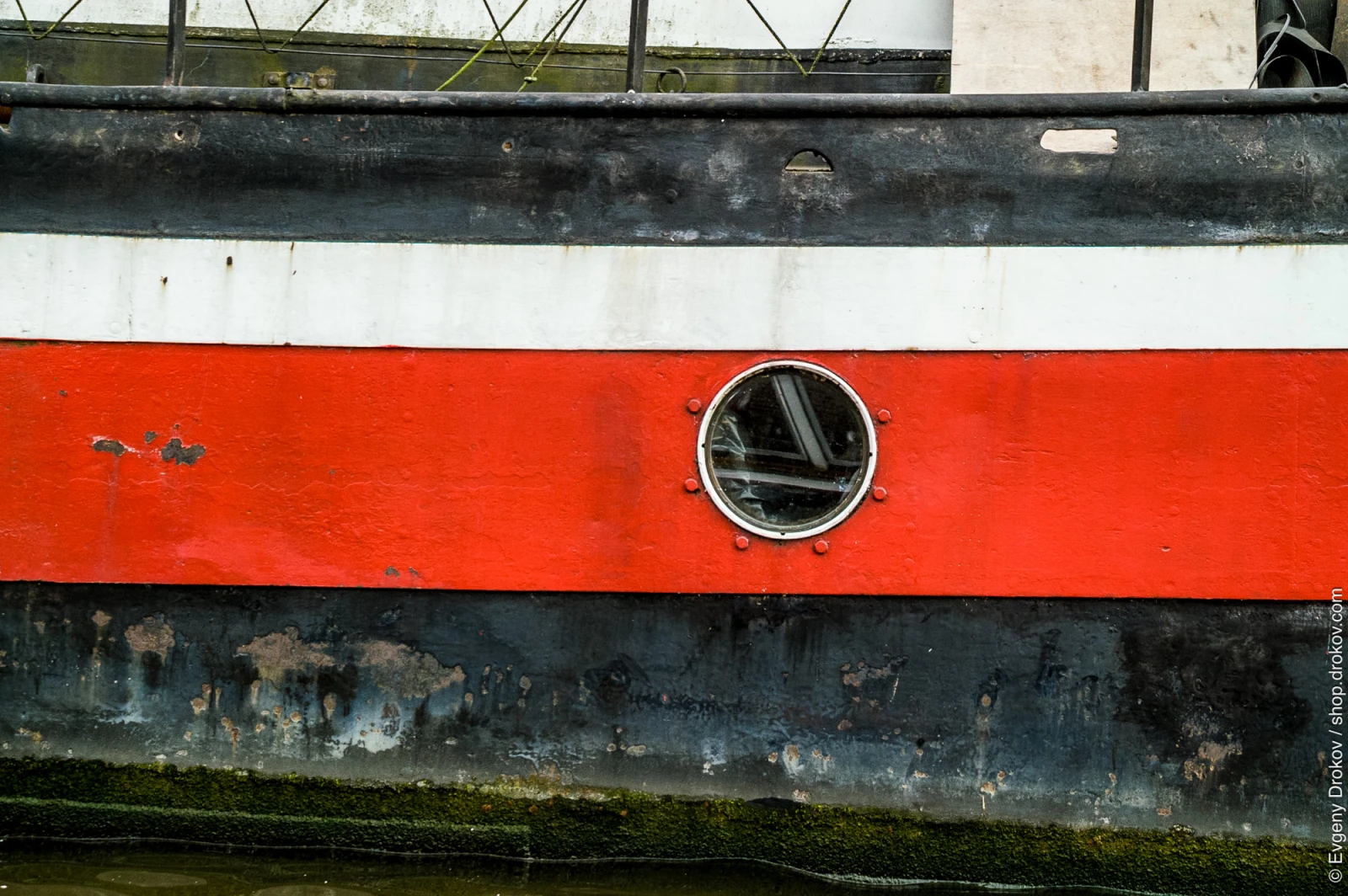This is a close-up of a boat's hull in Amsterdam, The Netherlands. The weathered paint and algae growth tell a story of time and the city's waterways.