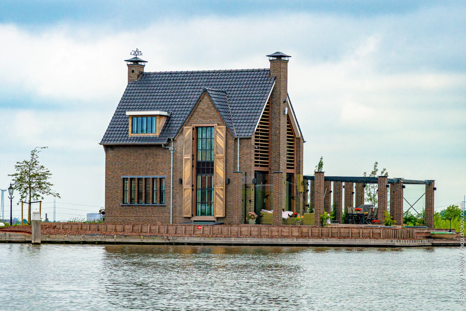 A modern brick house stands on the water in Rottemeren, Rotterdam, The Netherlands. This architectural marvel showcases contemporary design integrated with its natural surroundings, offering a serene waterside living experience.