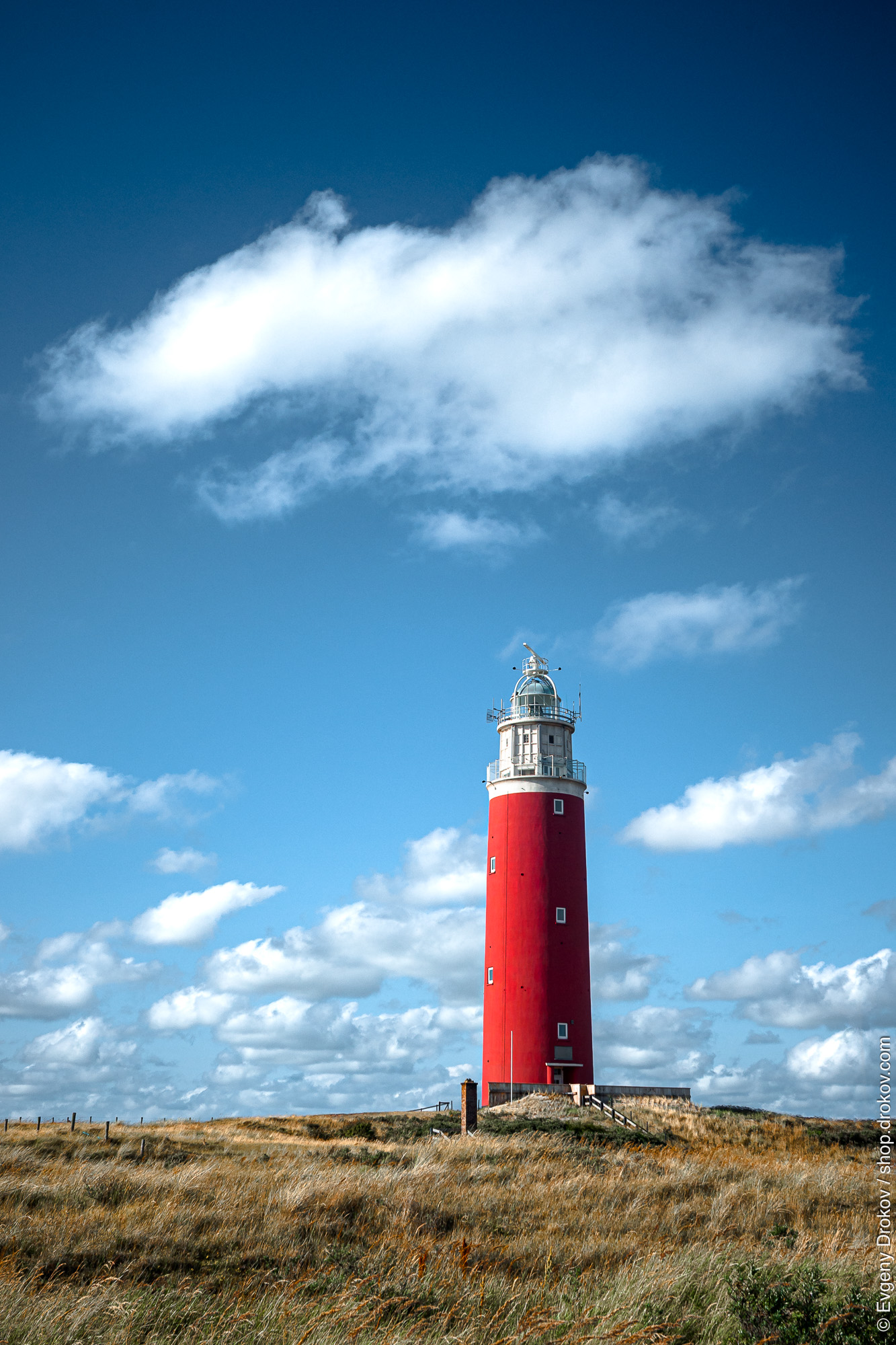 A striking red Lighthouse Texel stands tall against a vibrant blue sky dotted with fluffy white clouds. The lighthouse, situated on a grassy dune, is a beacon of guidance. Its purpose is clear: to guide ships safely.