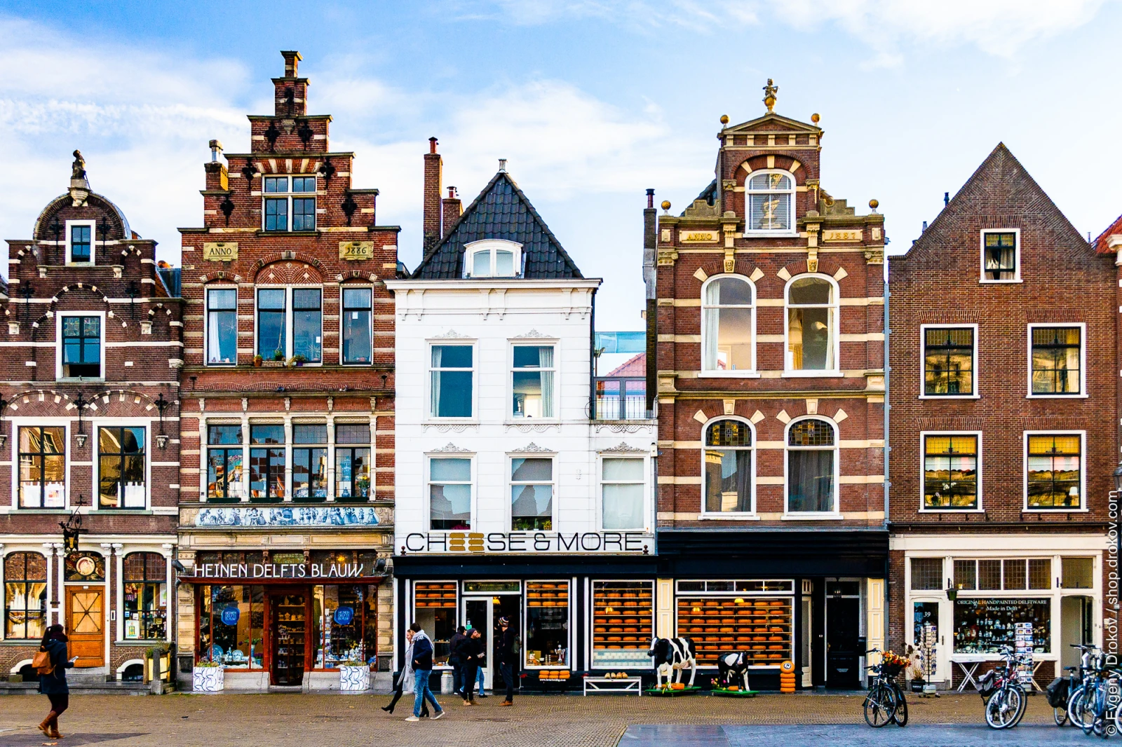 Autumnal Delft, Netherlands, showcases historic architecture and local commerce. People stroll past shops like "Heinen Delfts Blauw" and "Cheese & More," highlighting the city's charm and vibrant street life.