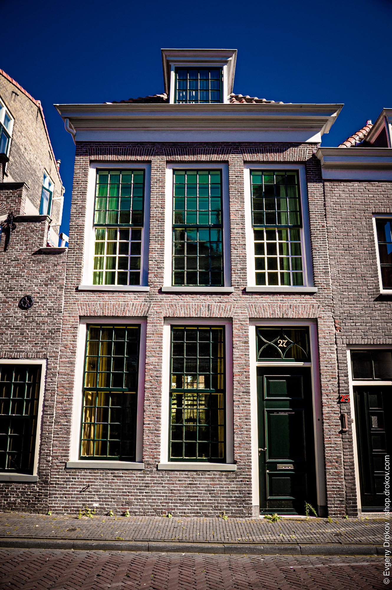 This is a classic Dutch townhouse in Delft, Zuid Holland, The Netherlands. The architecture showcases the region's historical building style, with its brick facade and prominent windows.