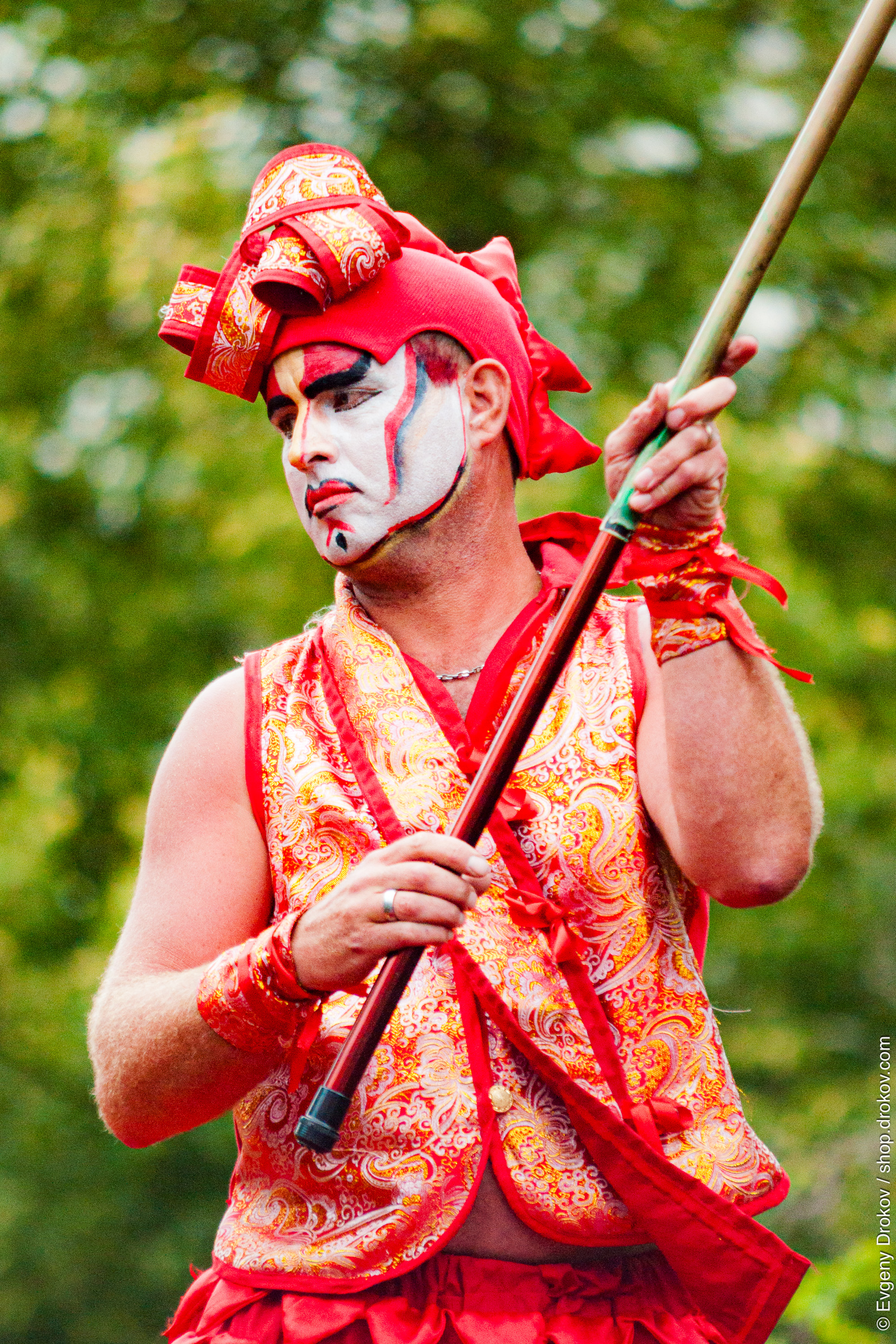 A performer in elaborate red and gold attire, with striking face paint, participates in the Varend Corso (Floating Corso) in Delft, Zuid Holland, The Netherlands. This vibrant festival celebrates local culture and tradition with decorated boats and lively performances.