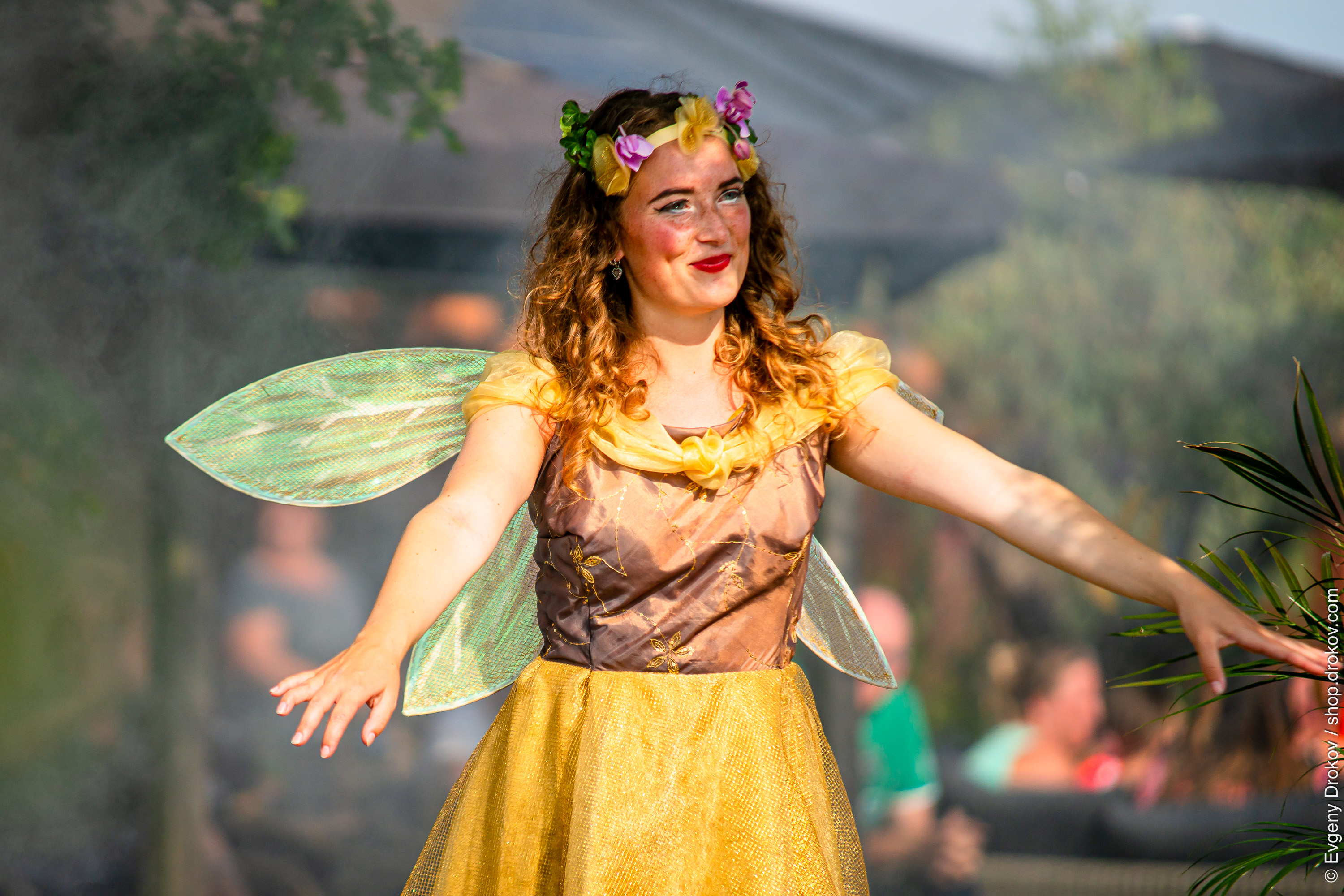 A young woman in a fairy costume participates in the Varend Corso 2019 event in Den Hoorn, Zuid Holland, The Netherlands. The vibrant festival celebrates local culture and floral artistry.