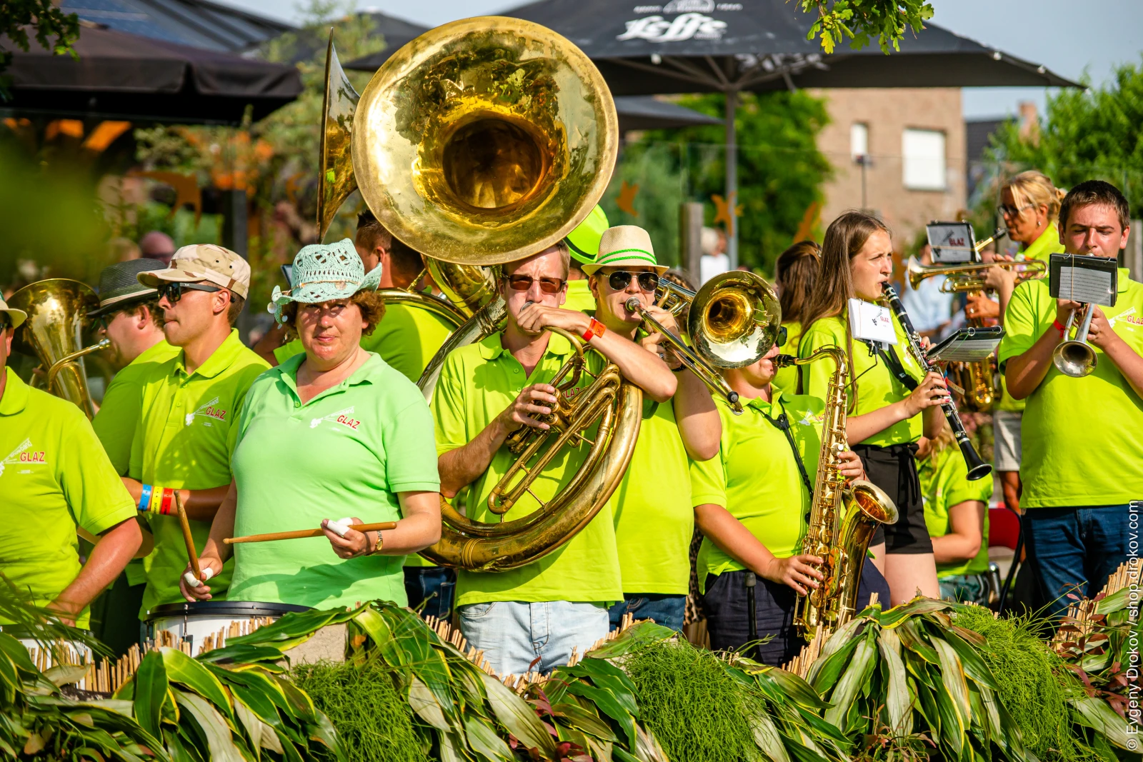 The "Glaz" band performs during the Varend Corso 2019 in Den Hoorn, Zuid Holland, The Netherlands. This vibrant procession celebrates local culture and community spirit with a lively musical accompaniment.