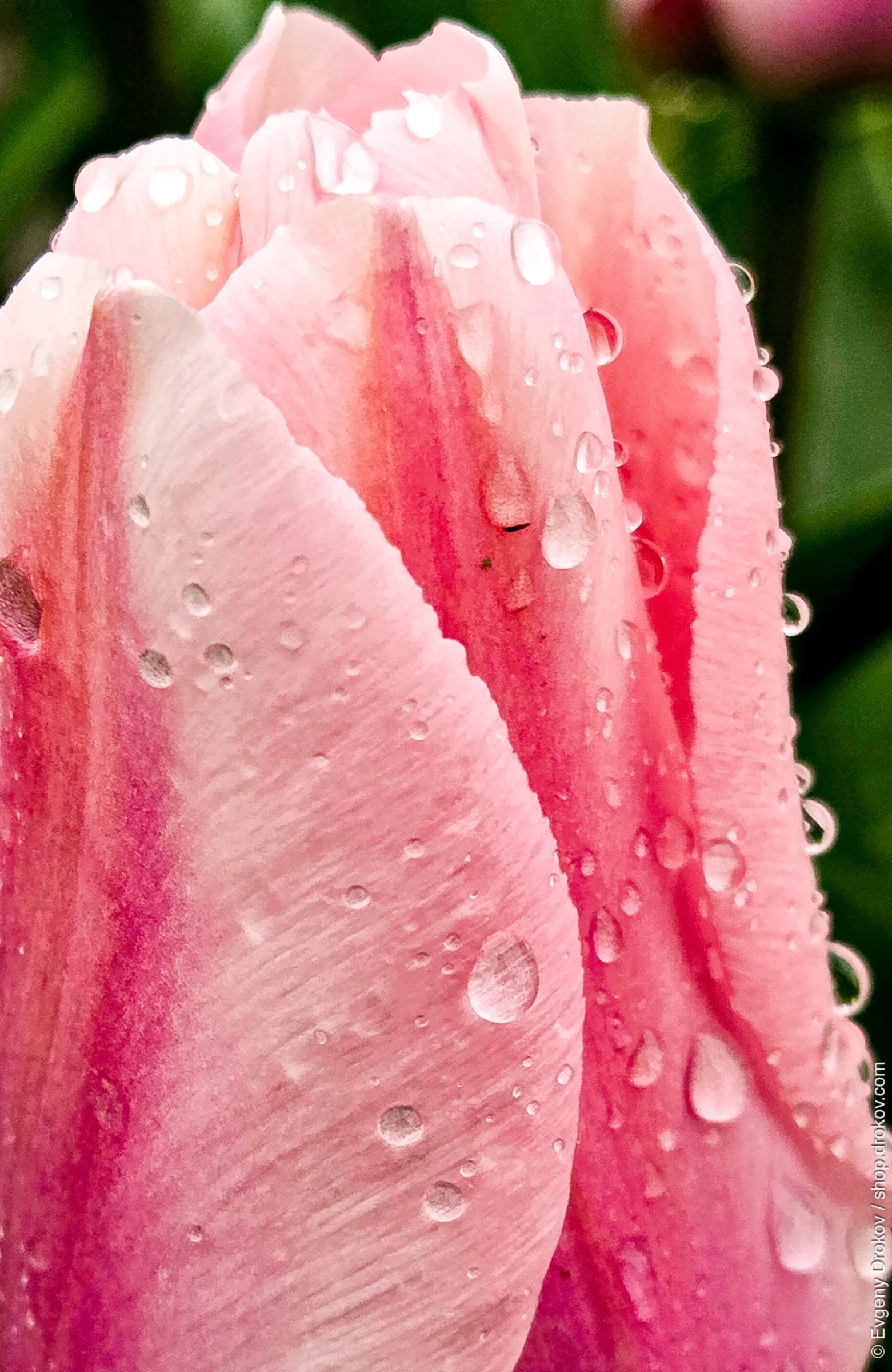 A close-up reveals the delicate beauty of pink tulip petals adorned with glistening water droplets. The vibrant colors and intricate textures are captured in stunning detail, showcasing nature's artistry after a fresh rain.