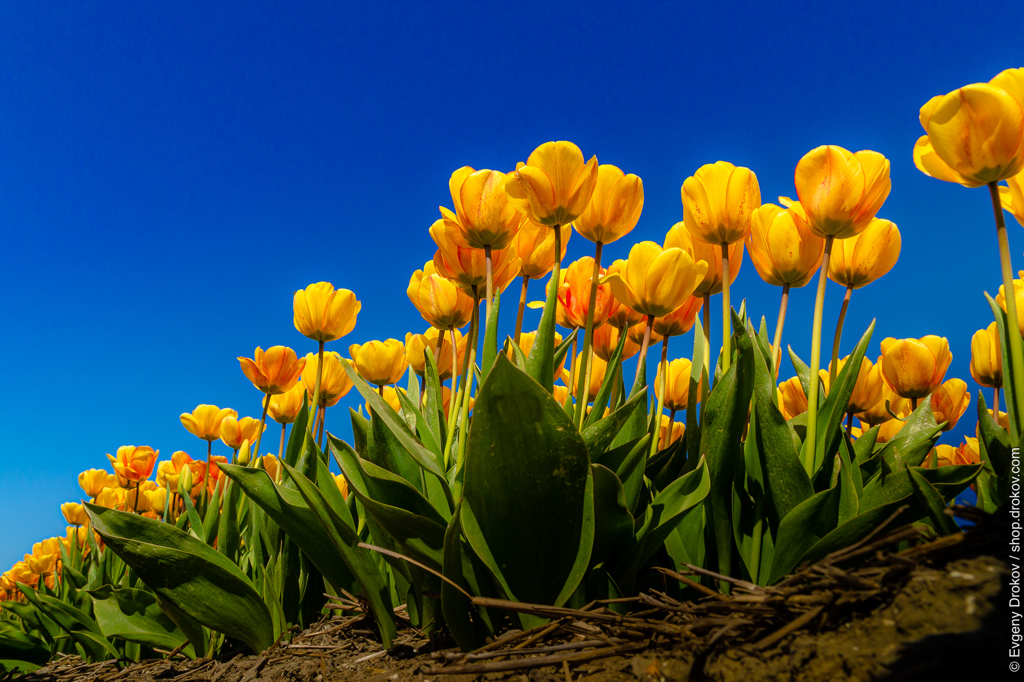 Vibrant yellow tulips bloom under a clear blue sky in Espel, Flevoland, The Netherlands. This striking display captures the essence of the Noordoostpolder's renowned tulip fields, showcasing nature's brilliance.