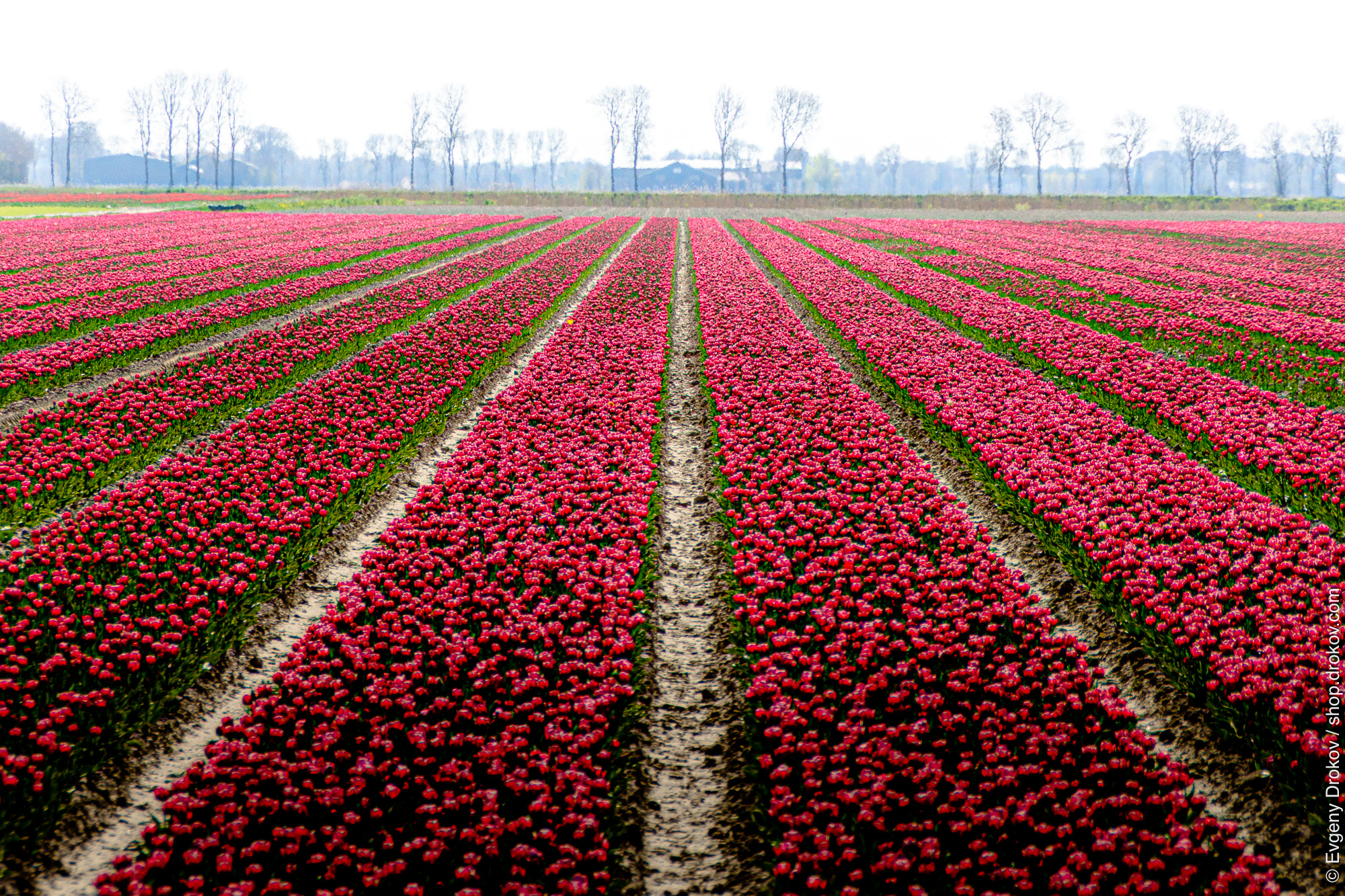 Vast rows of vibrant red tulips stretch across the landscape in Bant, Flevoland, The Netherlands. This striking display captures the essence of the Noordoostpolder's renowned tulip fields, showcasing the region's agricultural beauty and the peak bloom of these iconic flowers.