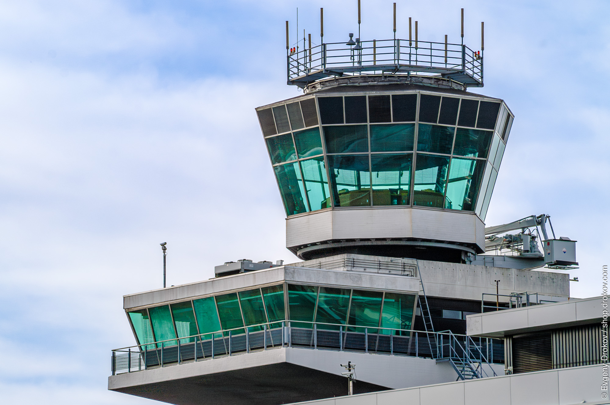 This airport control tower in Amsterdam, The Netherlands, is the central hub for monitoring and directing air traffic. Its distinctive teal windows offer a clear vantage point for air traffic controllers to ensure safe and efficient operations.