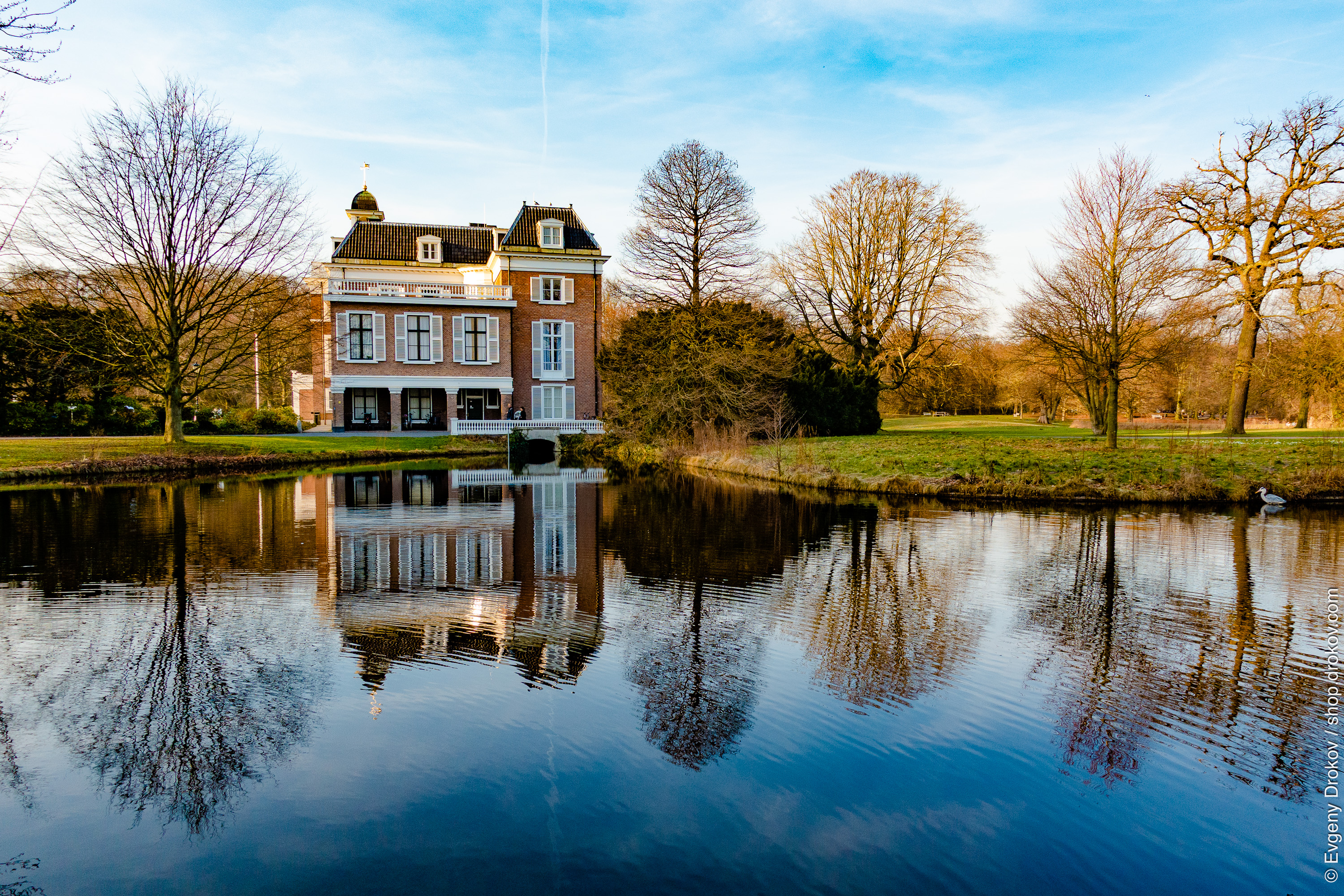 A stately brick manor house stands reflected in a calm canal. Bare trees frame the structure, their branches stark against a bright blue sky. This tranquil winter vista was captured in The Hague, Zuid Holland, The Netherlands, in February.