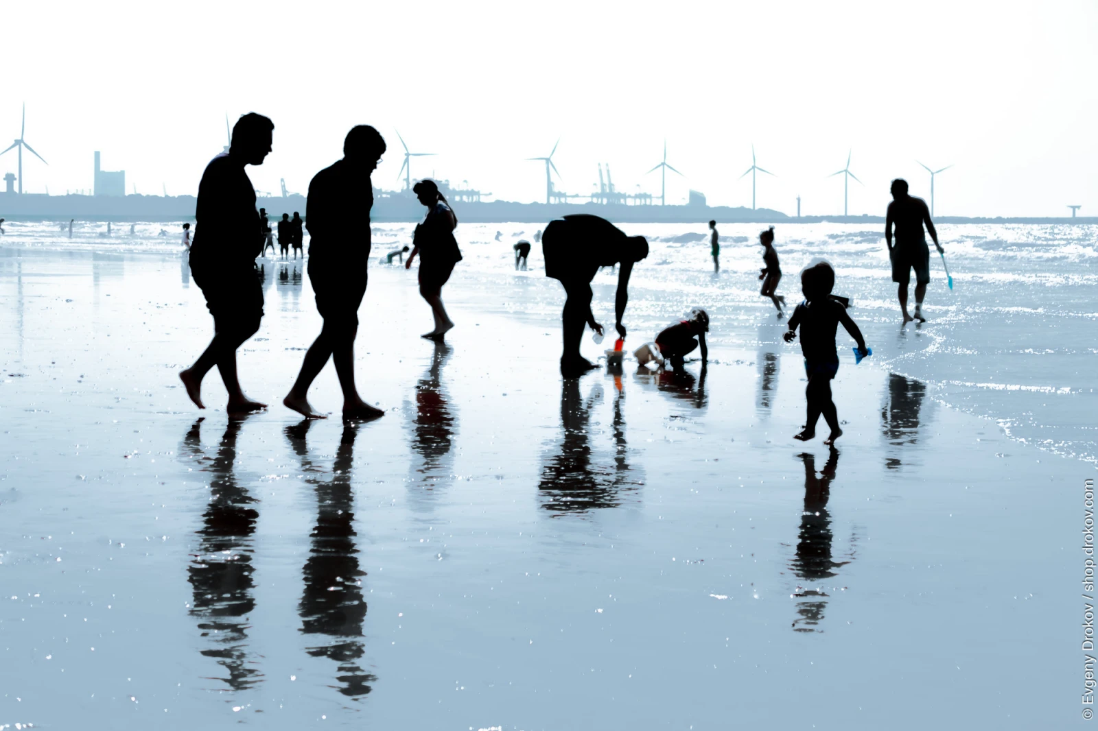 Silhouettes of a family enjoy a bright, sunny day at the beach. They are walking, playing in the water, and interacting with each other, creating cherished memories against a backdrop of wind turbines and a harbor.