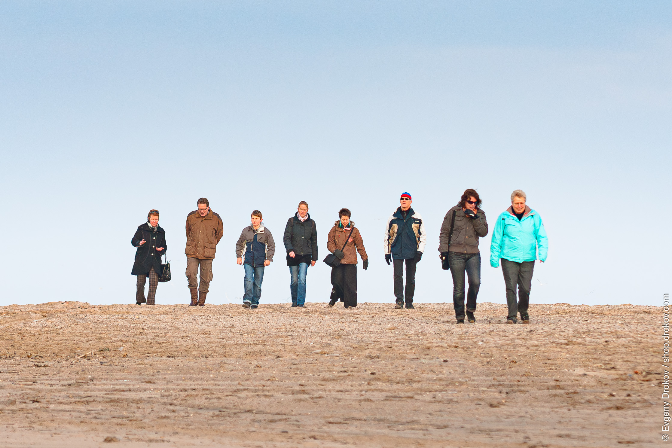 A group of eight individuals walks along the sandy expanse of Hoek van Holland, Zuid Holland, The Netherlands. They are enjoying a leisurely stroll, taking in the coastal atmosphere.