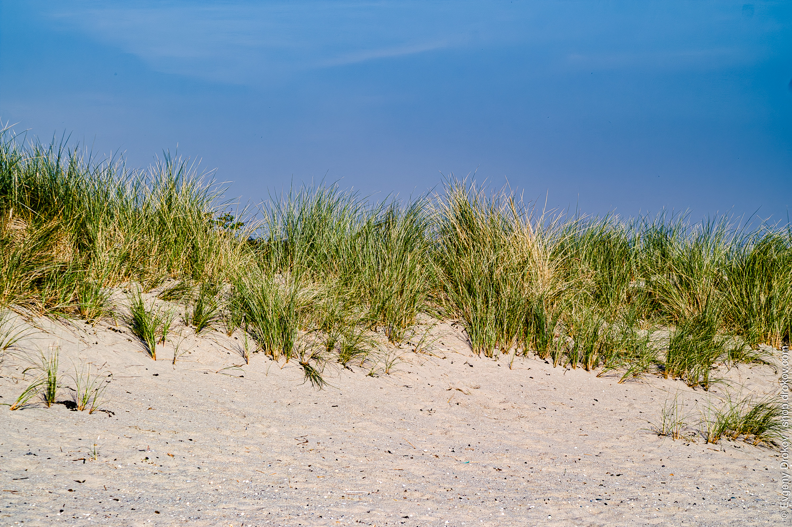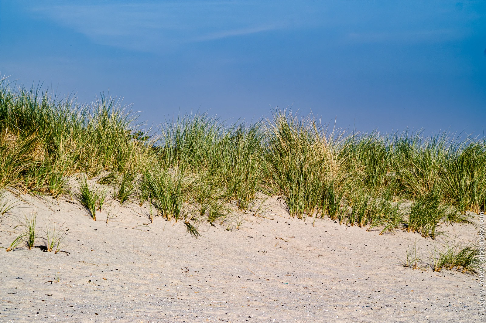 Coastal dune grasses thrive on the sandy beach. The vibrant green grass clings to the shifting sand, a testament to nature's resilience. The clear blue sky above completes the scene.