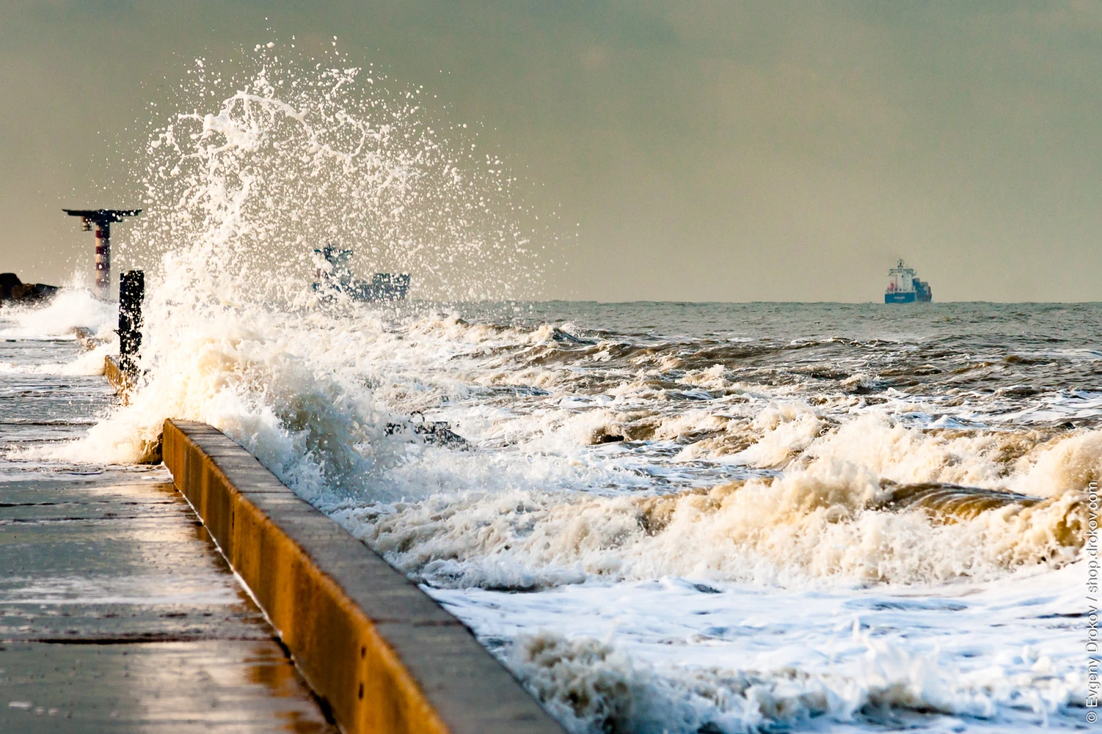 Waves crash against the pier at Hoek van Holland, Zuid Holland, The Netherlands. A cargo ship navigates the rough seas in the distance, showcasing the raw power of nature at this coastal location.