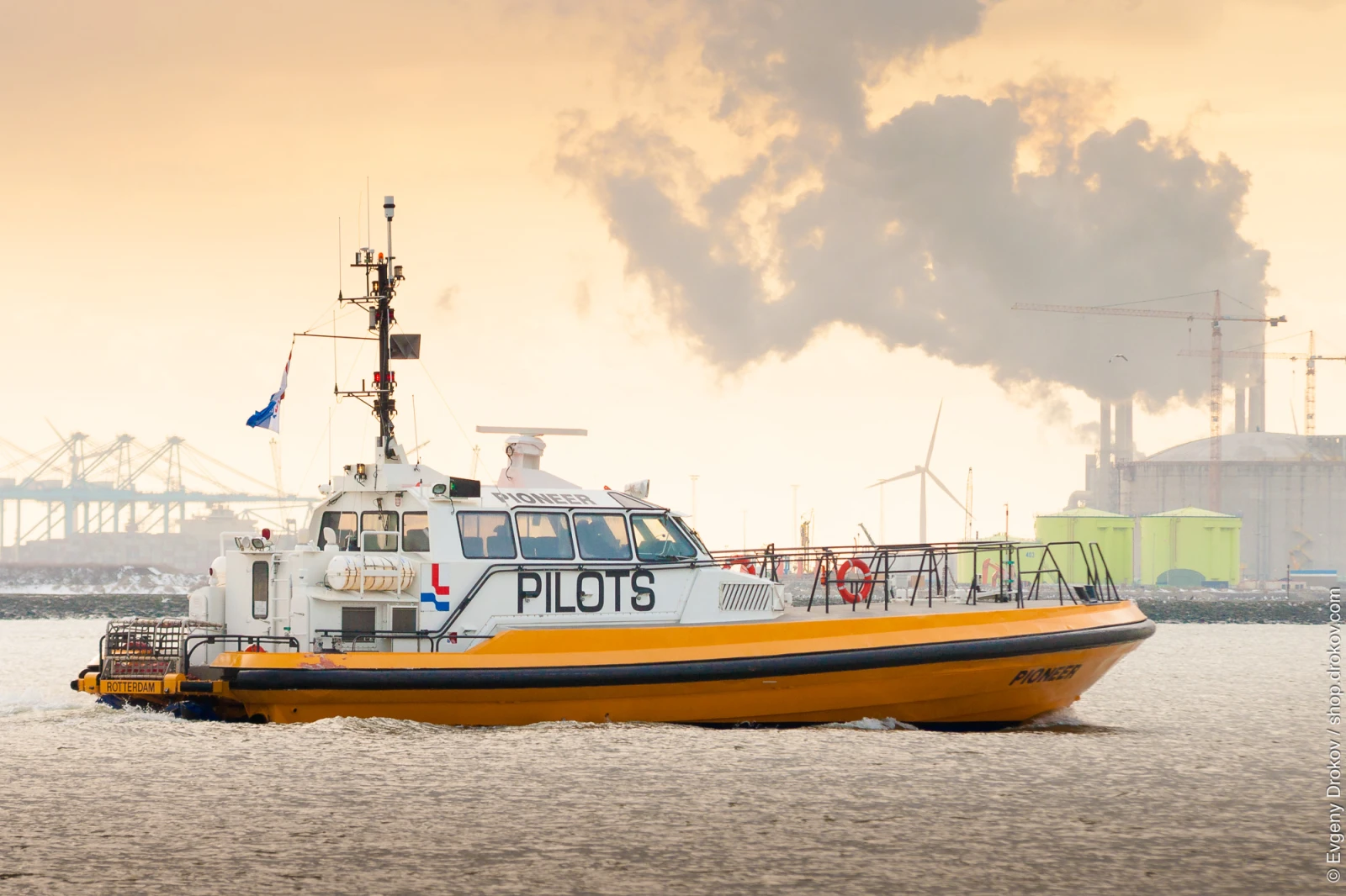 The pilot boat "Pioneer" navigates the waters of Hoek van Holland, Zuid Holland, The Netherlands. Its purpose is to guide larger vessels safely into port, a critical function for maritime operations.