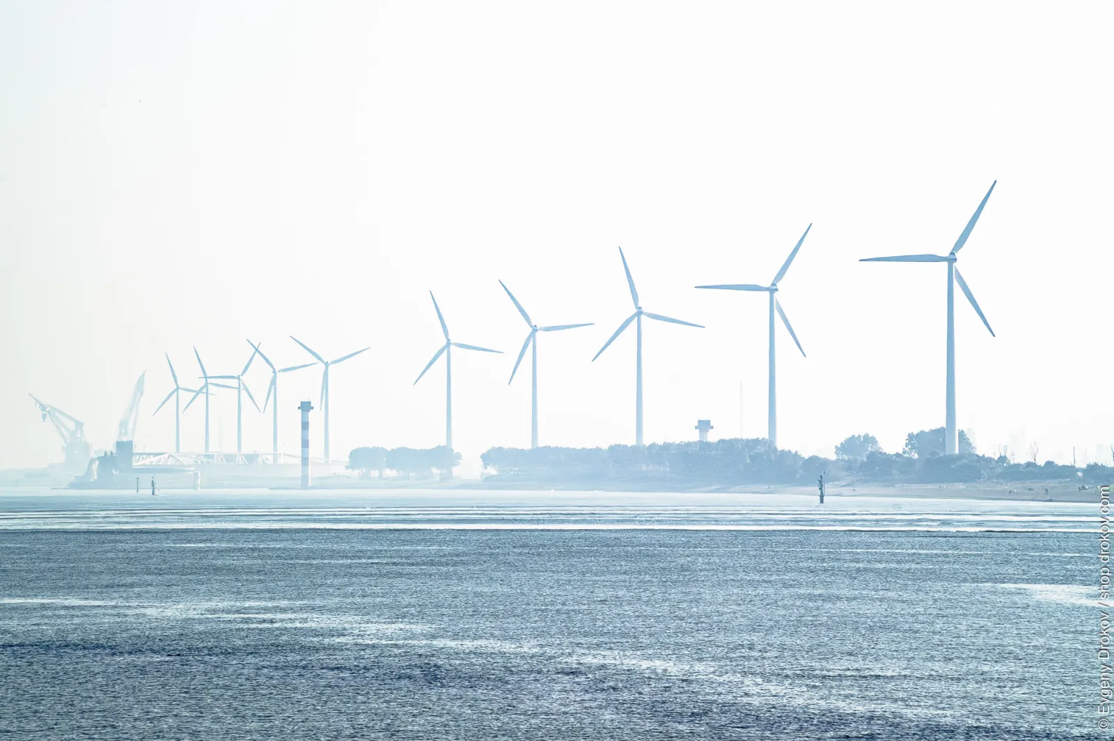 Wind turbines stand tall in Hoek van Holland, Zuid Holland, The Netherlands, harnessing the power of the wind. This expansive view captures the region's commitment to renewable energy.
