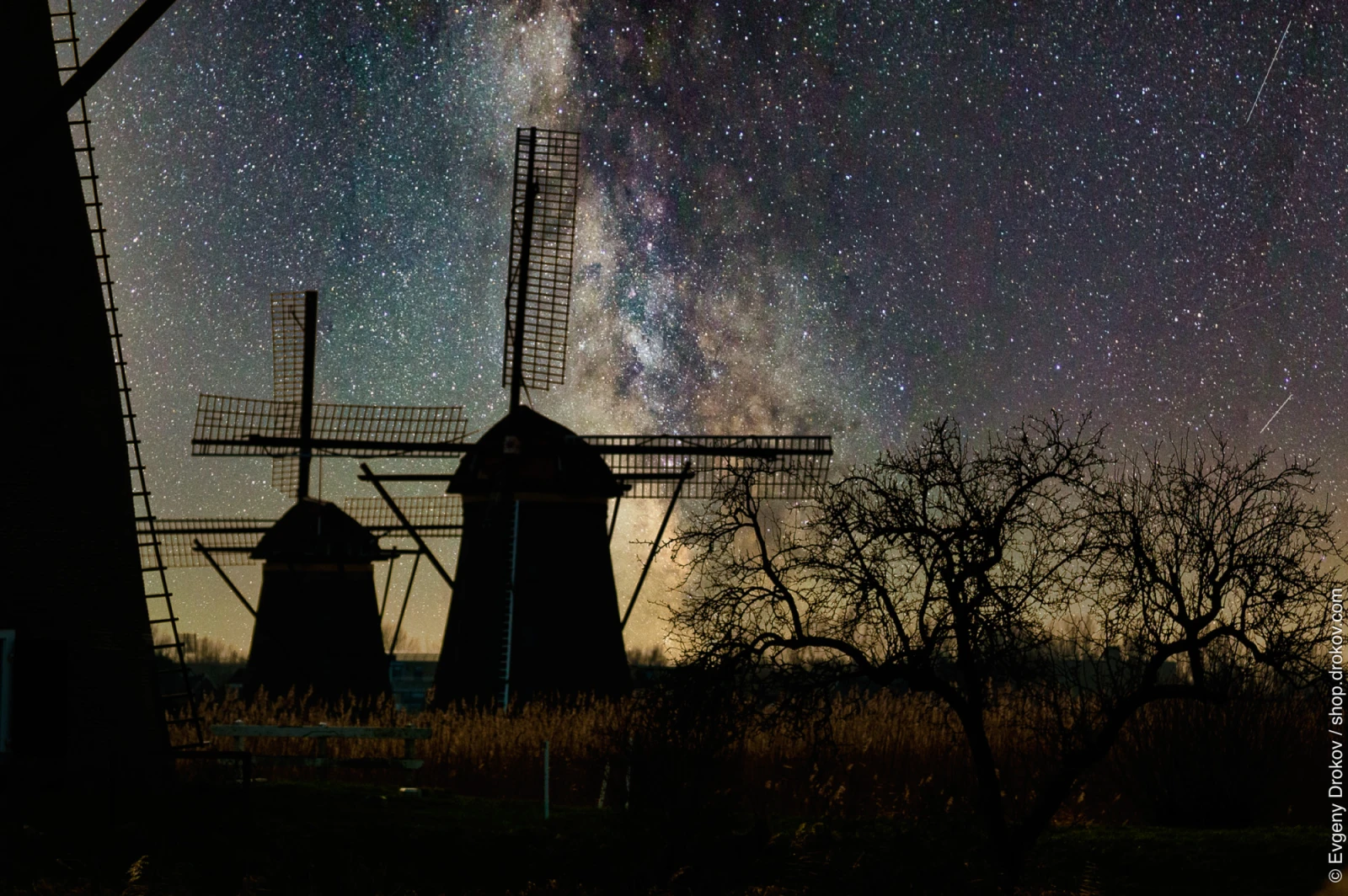 Silhouetted windmills stand against a breathtaking starry night sky, showcasing the Milky Way. This composition highlights the stark contrast between man-made structures and the vastness of the cosmos, creating a sense of wonder and timelessness.