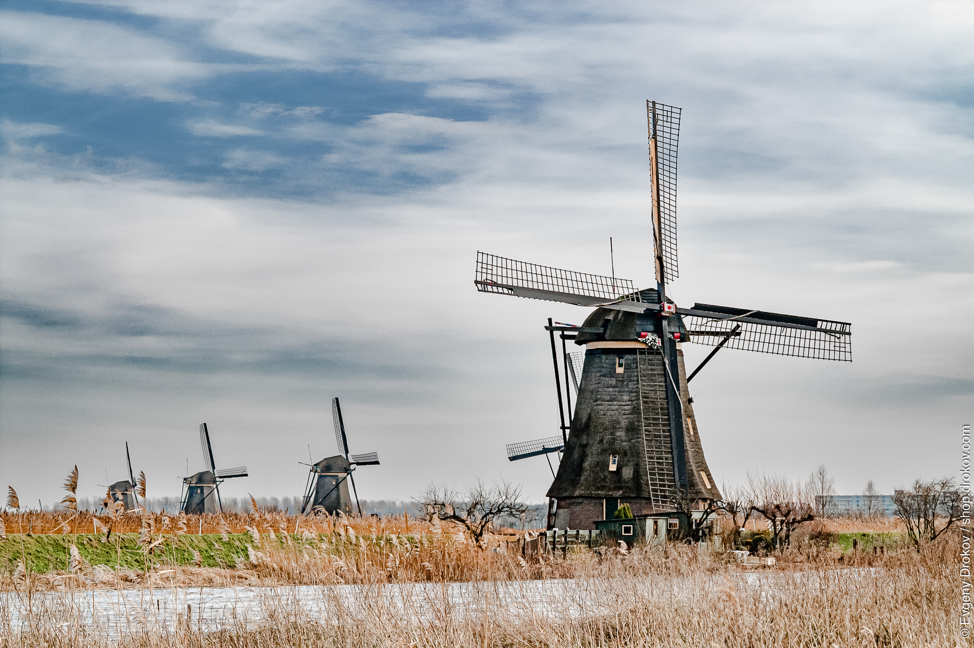 Three iconic Dutch windmills stand against a dramatic sky in Kinderdijk, Zuid Holland. These historic structures, a testament to Dutch ingenuity, are captured amidst reeds and a frozen waterway, evoking a serene, melancholic atmosphere.