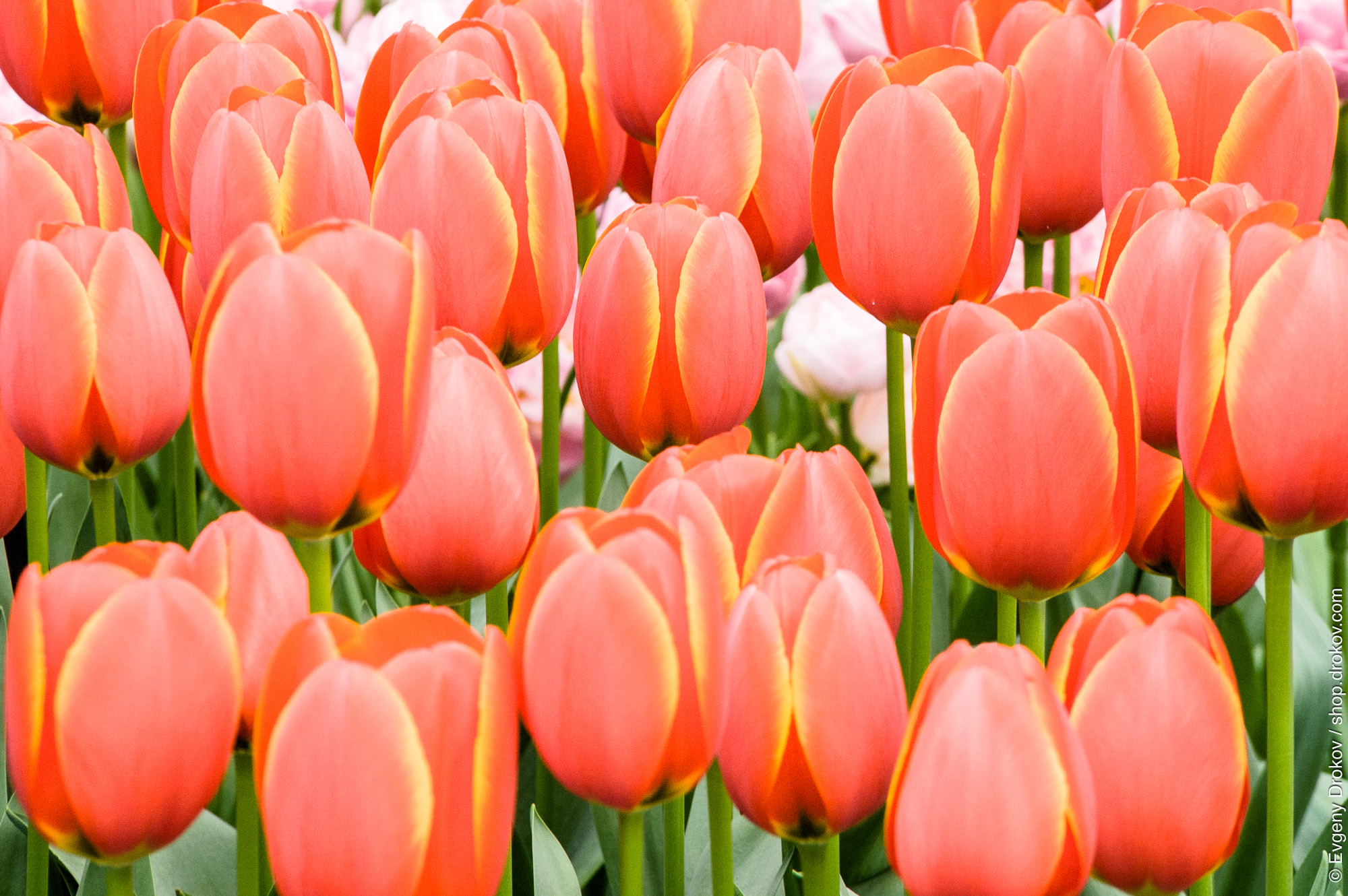 A vibrant display of coral-orange tulips in full bloom at Keukenhof Gardens in Lisse, The Netherlands. This composition captures the essence of spring's arrival, showcasing nature's artistry.