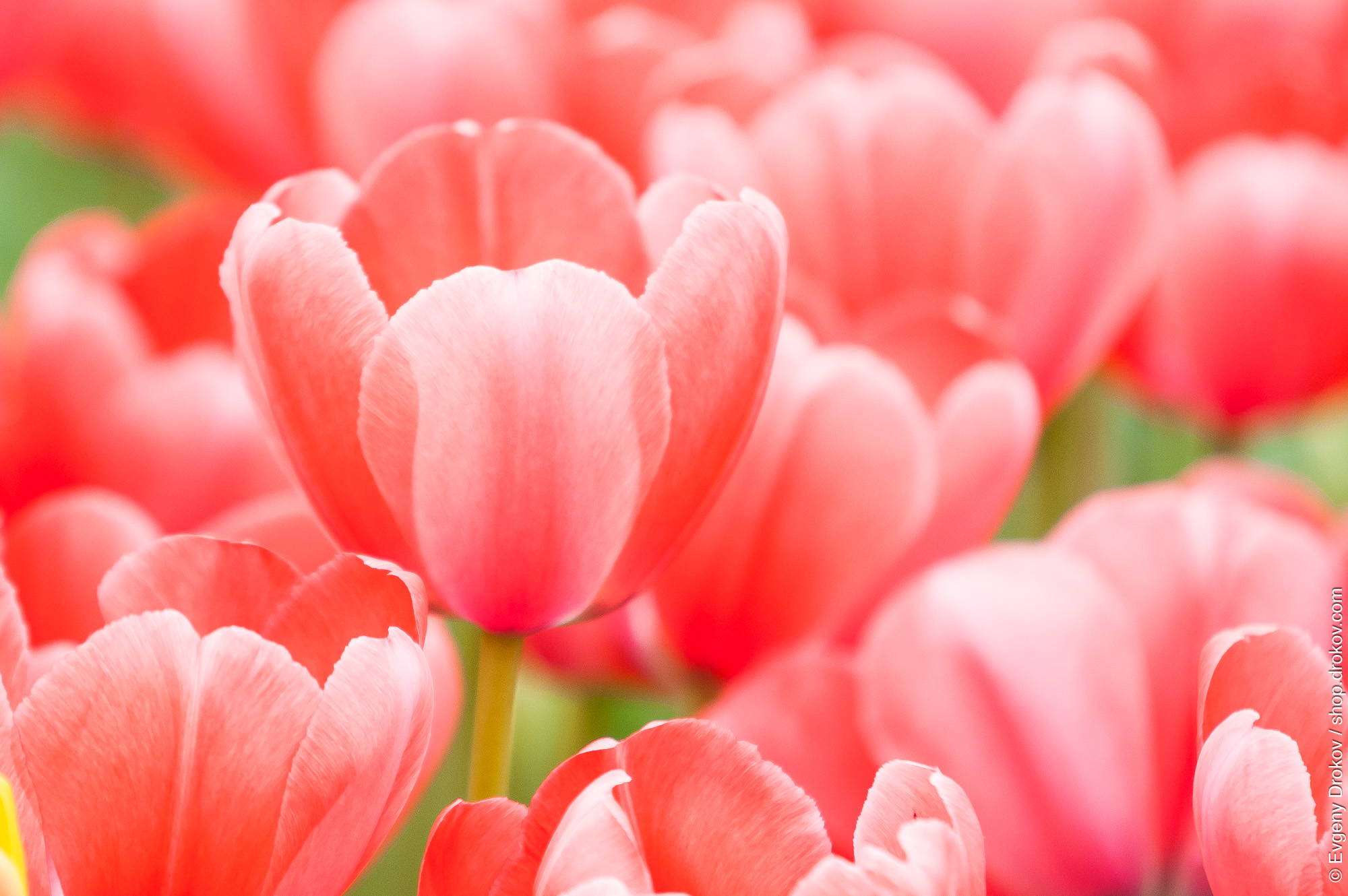 This is a close-up of vibrant coral tulips at Keukenhof Flower Park in Lisse, The Netherlands, captured in 2010. The composition highlights the delicate beauty and rich color of these spring blooms, showcasing the park's renowned floral displays.