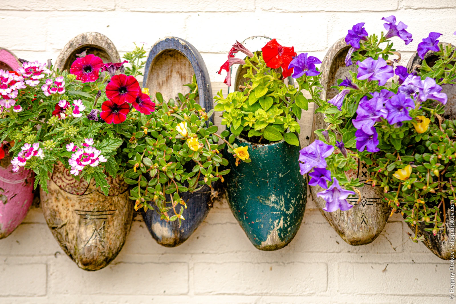 In Marken, Noord Holland, The Netherlands, traditional wooden clogs are repurposed as vibrant planters, showcasing a charming fusion of heritage and horticulture. This creative display adds a splash of color and character to the brick wall.