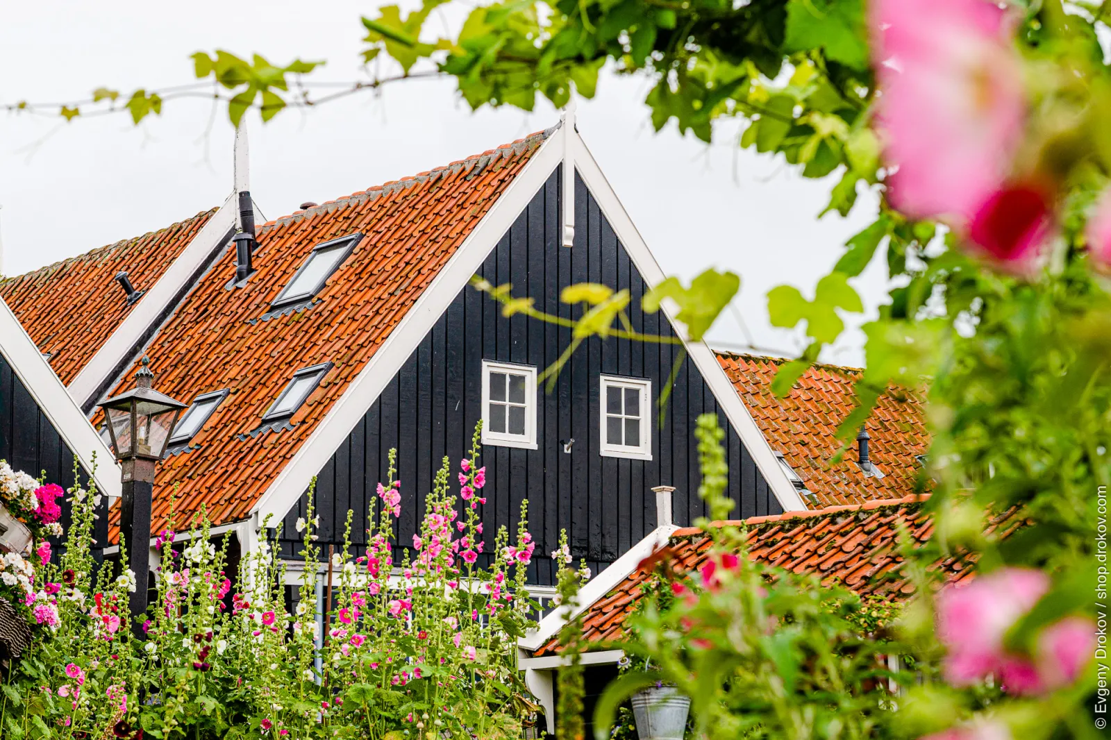 This is a close-up of traditional Dutch architecture in Marken, Noord Holland. The vibrant hollyhocks in bloom add a splash of color to the historic black wooden house with its characteristic orange tiled roof. The composition captures the charm and beauty of this picturesque Dutch village.