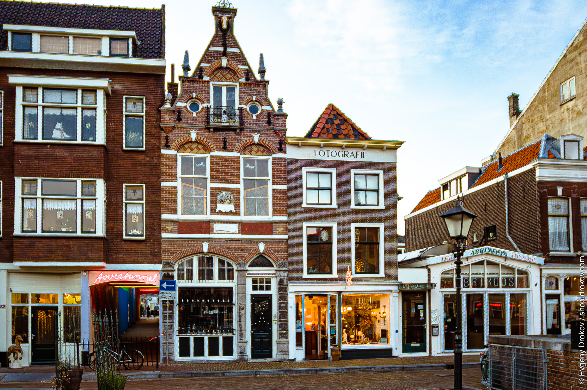 This is Delftshaven, Rotterdam, Zuid Holland, The Netherlands. The architecture showcases traditional Dutch design, with ornate facades and a prominent "Fotografie" sign indicating a photography studio. The vibrant neon sign "Aovertunnel" hints at a lively entertainment district.