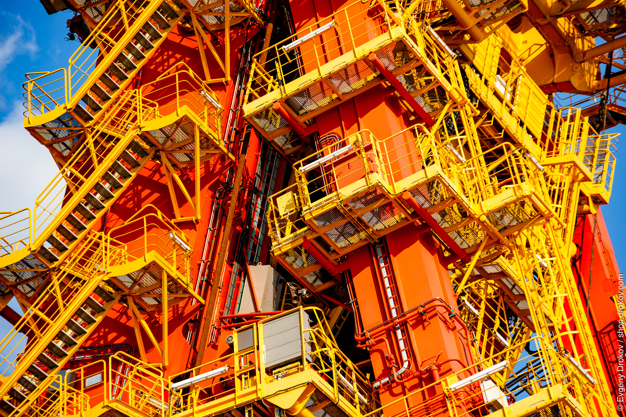 This striking composition captures the intricate yellow and orange industrial framework of a massive crane at the Port of Rotterdam, Zuid Holland, The Netherlands. The vibrant colors and geometric patterns highlight the engineering marvel of this vital shipping hub.