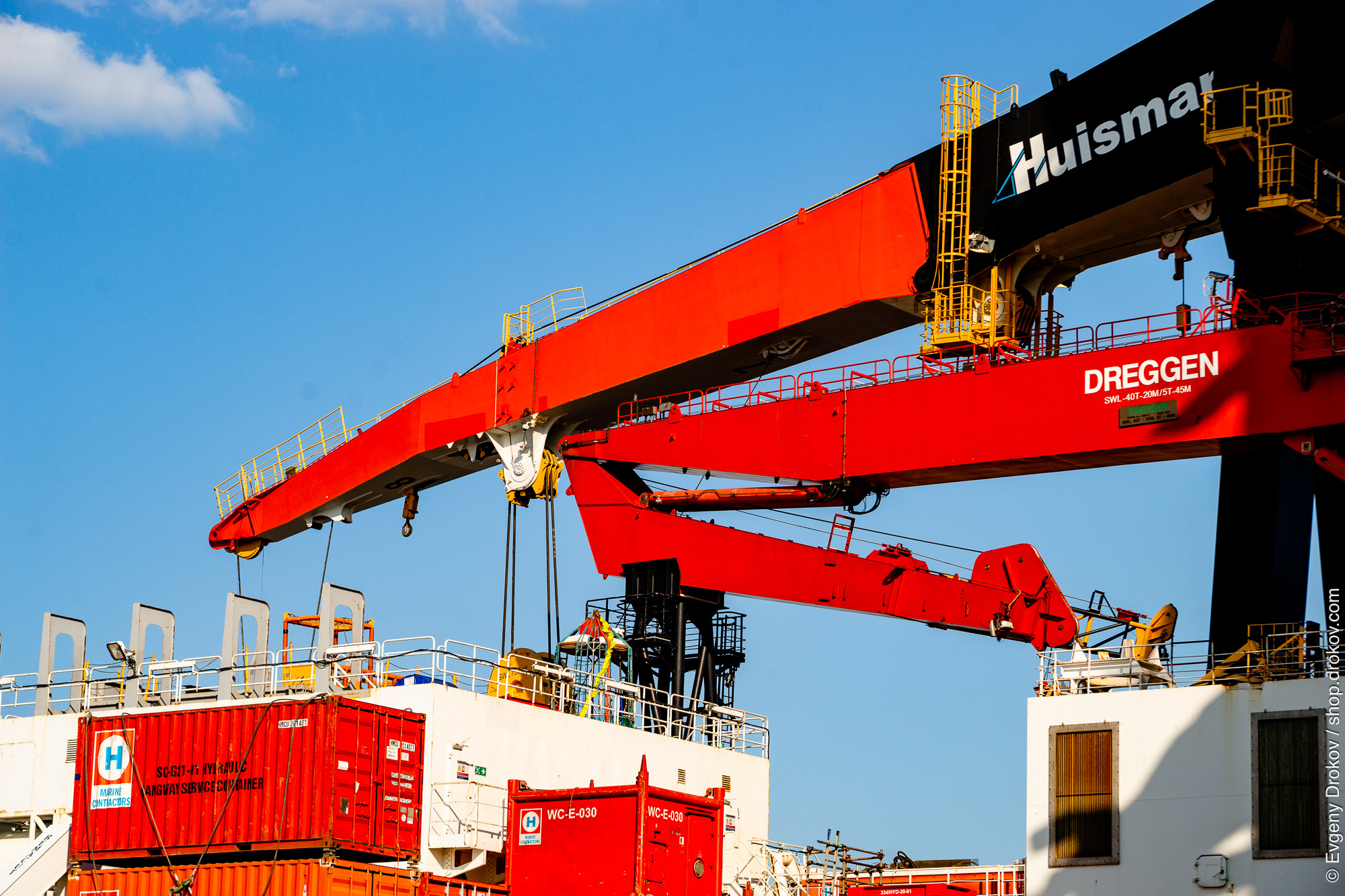 A massive Huisman crane, identified as "DREGGEN," operates at the Port of Rotterdam in Zuid Holland, The Netherlands. This powerful machinery is actively engaged in the loading and unloading of shipping containers, a critical function for global maritime trade.