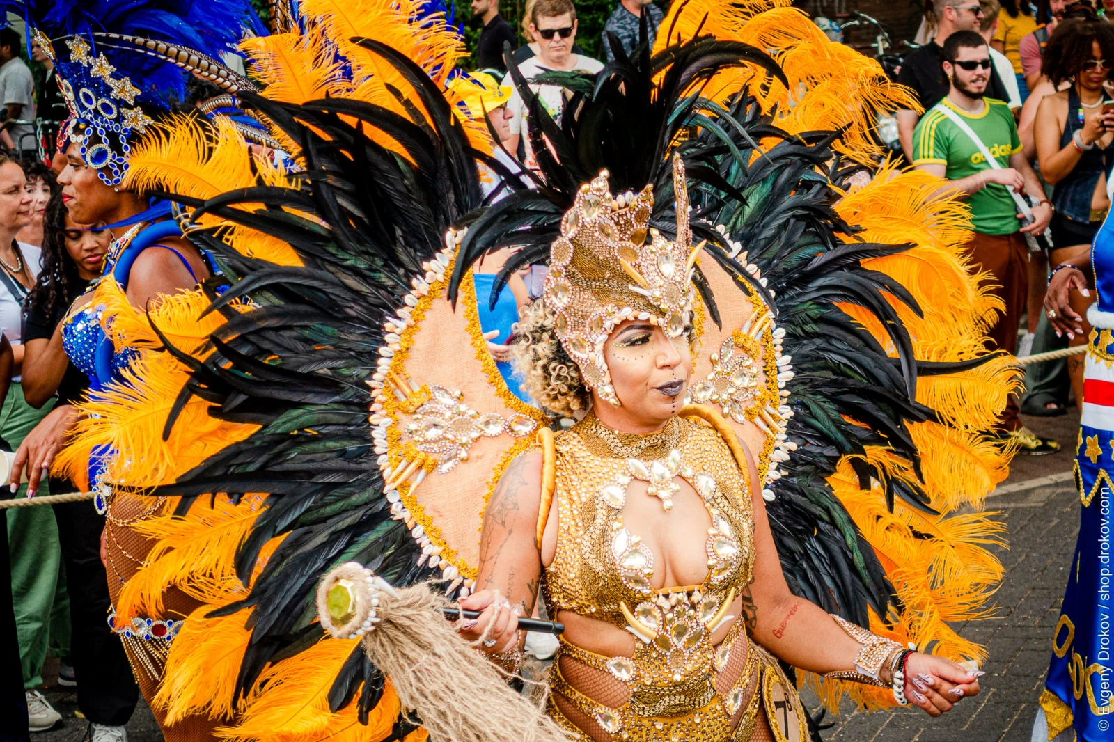 A vibrant Carnival parade participant, adorned in dazzling gold, orange, and black feathered regalia, confidently strides forward. The elaborate costume, featuring intricate beadwork and shells, is a testament to the artistry and passion of the celebration. This is a powerful display of cultural expression.