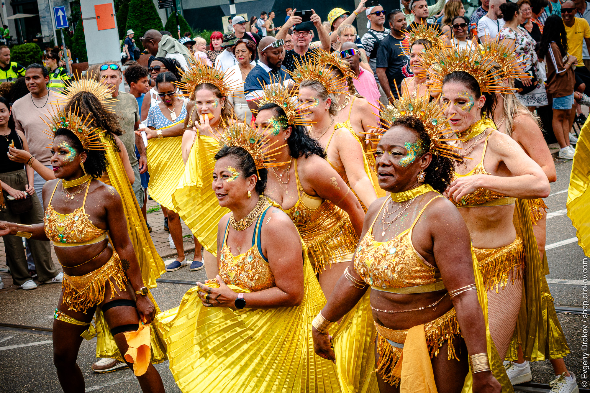 A vibrant group of women, adorned in dazzling gold costumes and elaborate headpieces, participate in a lively street parade. Their enthusiasm and celebratory attire are clear. This is a cultural celebration, showcasing the joy and artistry of the community.