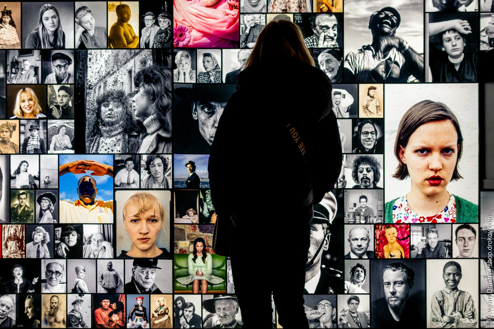 A visitor stands before a striking collage of portraits at the Nederlands Fotomuseum in Rotterdam, Zuid Holland, The Netherlands. This display showcases a diverse collection of photographic works, inviting contemplation on identity and representation.