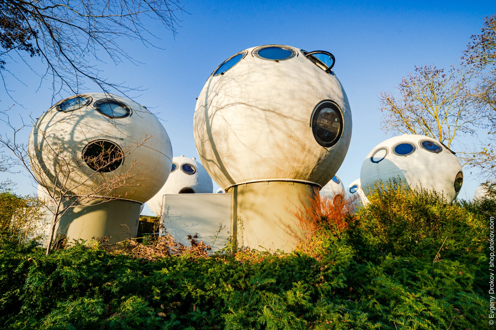 The distinctive "bolwoningen" (boll houses) in 's-Hertogenbosch, North Brabant, The Netherlands, are captured in late December. These unique spherical homes, designed by architect John Habraken, offer a glimpse into innovative residential architecture.