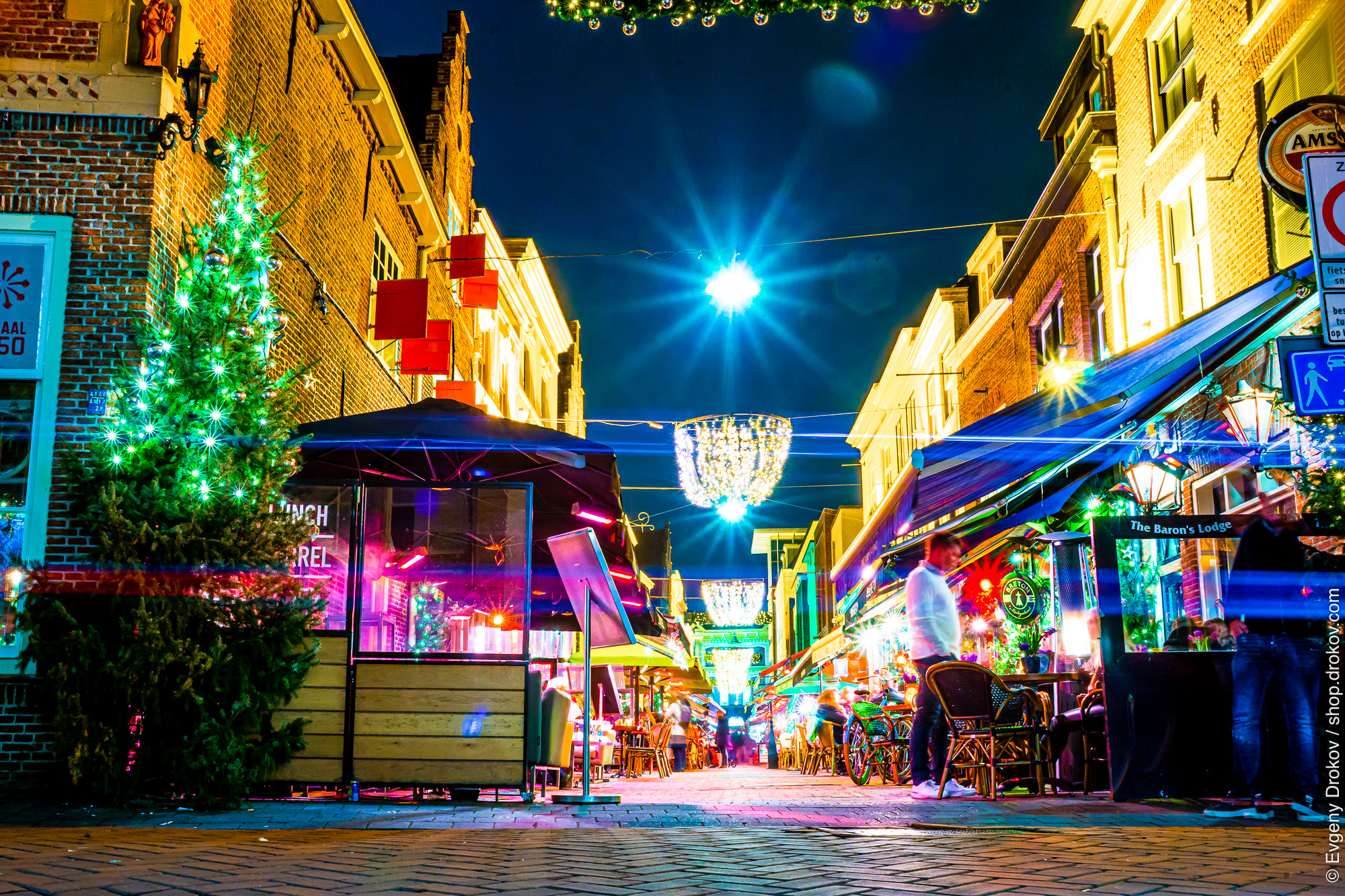 Festive lights illuminate a bustling street in 's-Hertogenbosch, Netherlands, at the end of December. People enjoy the vibrant atmosphere, celebrating the holiday season with illuminated decorations and outdoor dining.