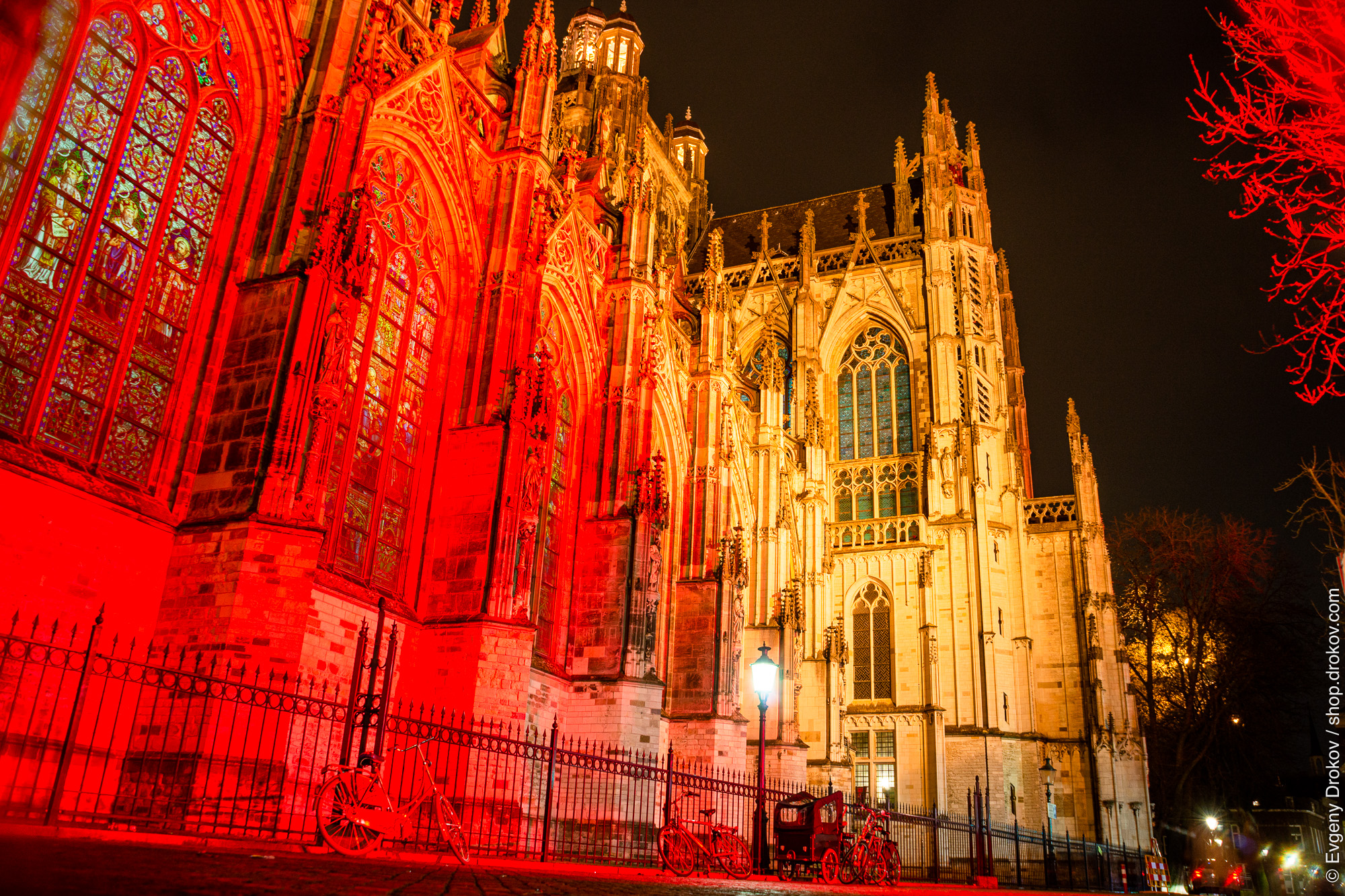 The Saint John's Cathedral in 's-Hertogenbosch, North Brabant, The Netherlands, is illuminated in vibrant red and warm yellow light at the end of December. This dramatic lighting highlights the cathedral's Gothic architecture and stained-glass windows, creating a striking nocturnal spectacle.