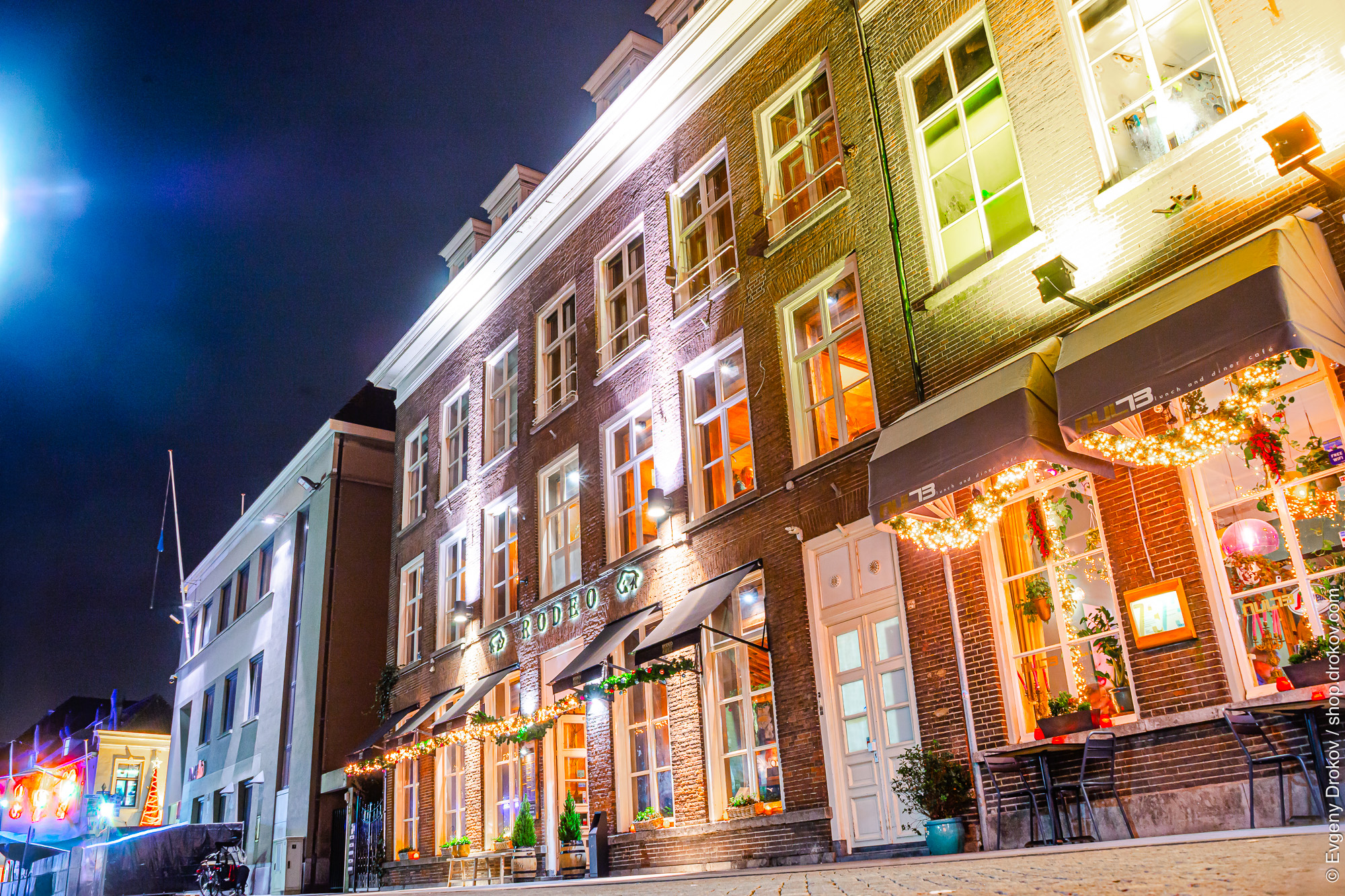 Festive lights adorn the facade of "Rodeo" restaurant in 's-Hertogenbosch, Netherlands, at the close of December. The warm glow emanates from within, illuminating the brickwork and inviting patrons to experience the holiday spirit.