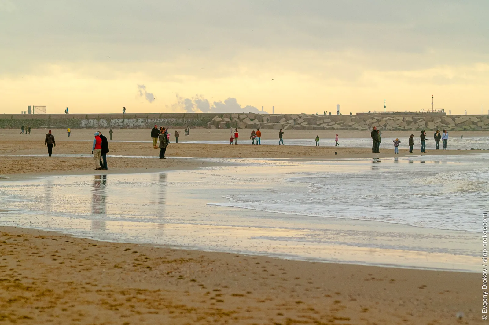 People enjoy the tranquil golden hour at Scheveningen beach, Zuid Holland, The Netherlands. They stroll along the shore, embracing the serene atmosphere and gentle waves.