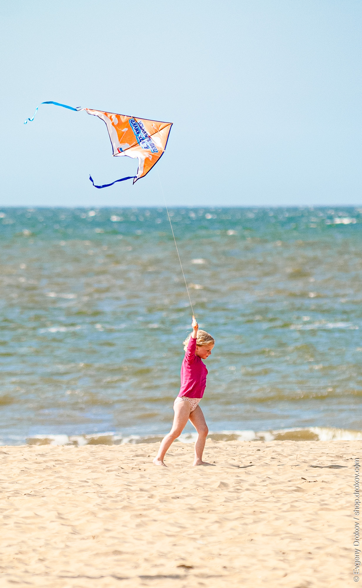 A young girl joyfully flies a kite on the sandy shores of Scheveningen, Zuid Holland, The Netherlands. This moment captures the pure delight of a spring day by the sea.