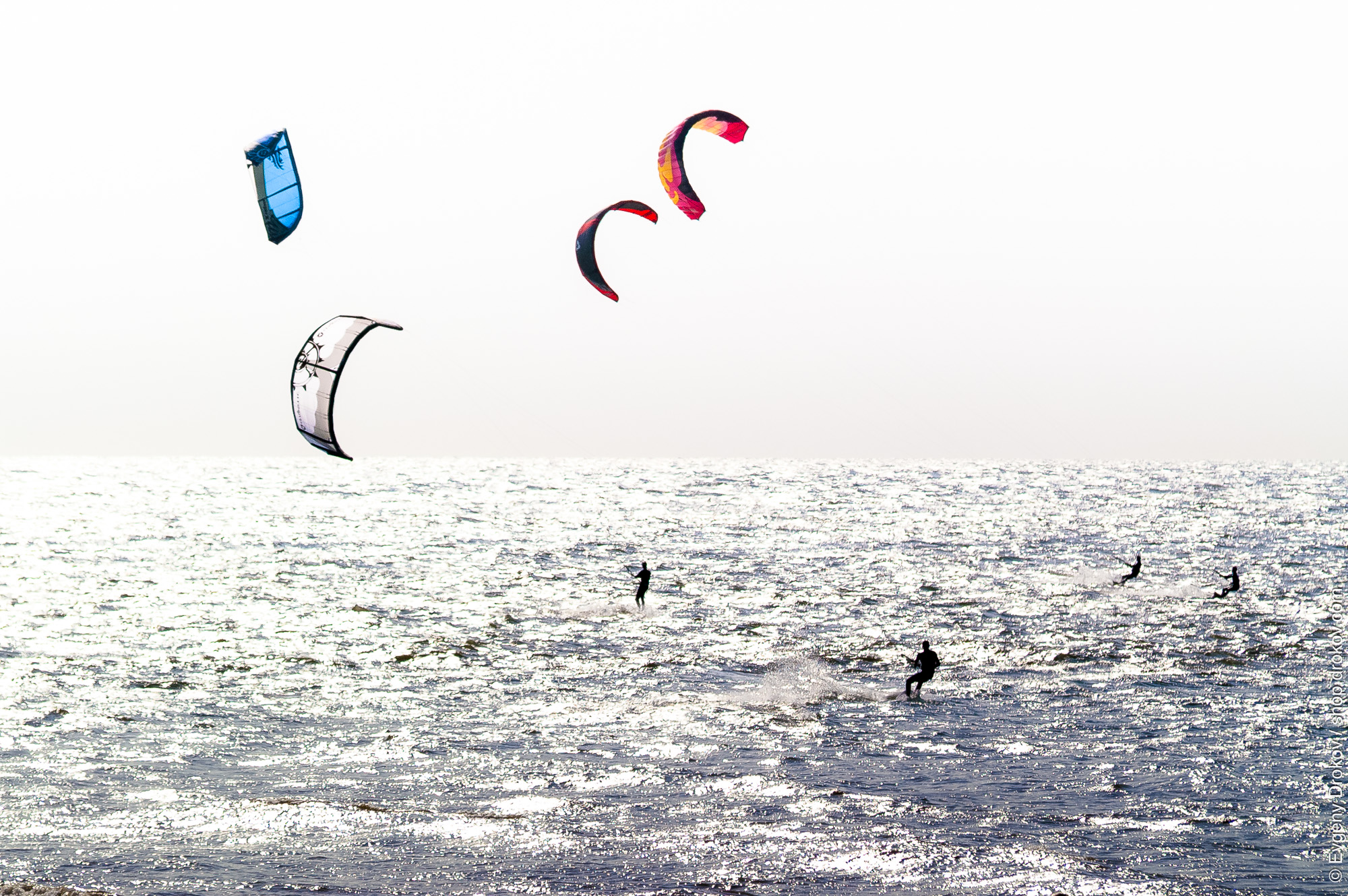 Kitesurfers harness the wind on the sparkling waters of Scheveningen, Zuid Holland, The Netherlands. This dynamic display captures the thrill of the sport against a bright sky.